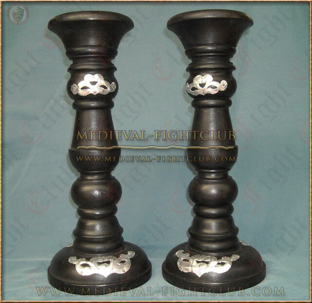 This candleholder is solid and tall. Carved from 100% wood, this candleholder has been painted black and adorned with a silver metal motif. It provides a stunning effect and candle light is reflected off the silver surfaces.