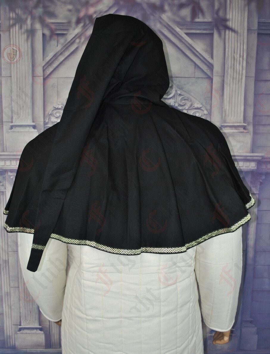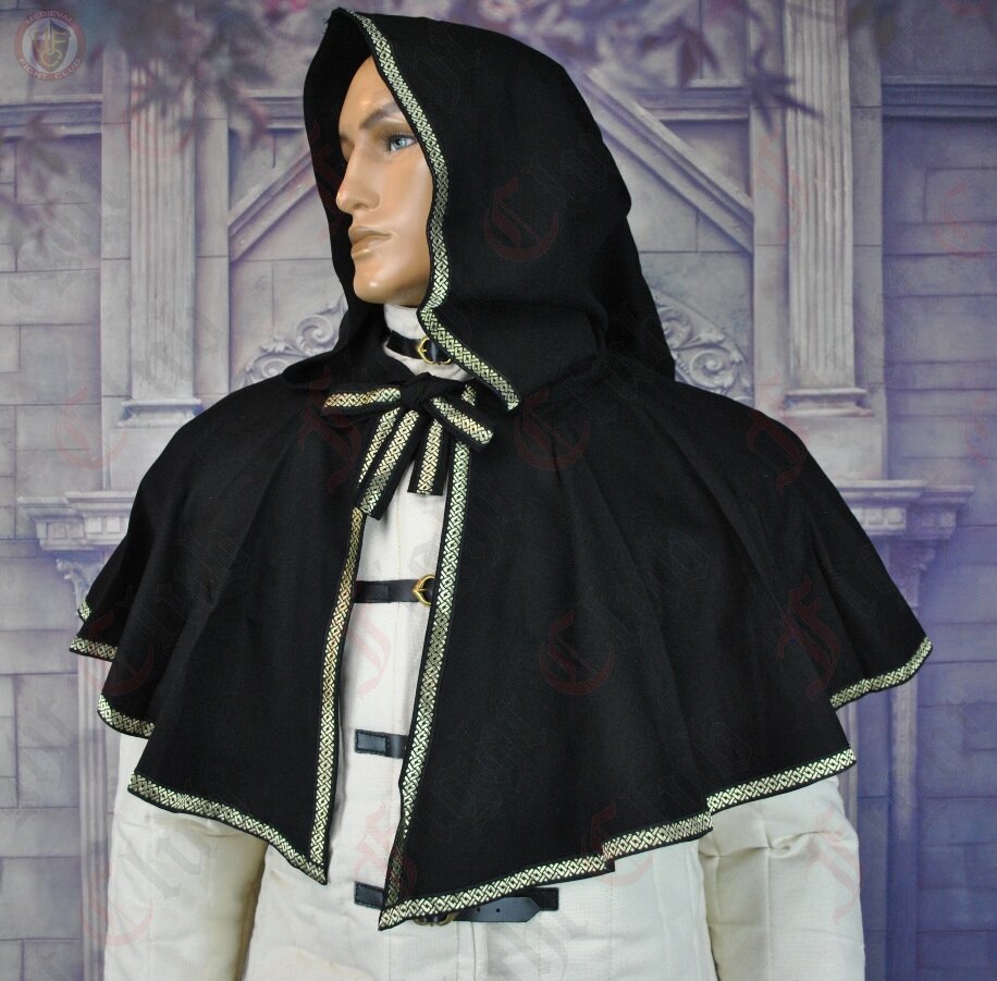Fantastic medieval black shoulder cape with liripipe hood - 100% black cotton edged with gold braid.