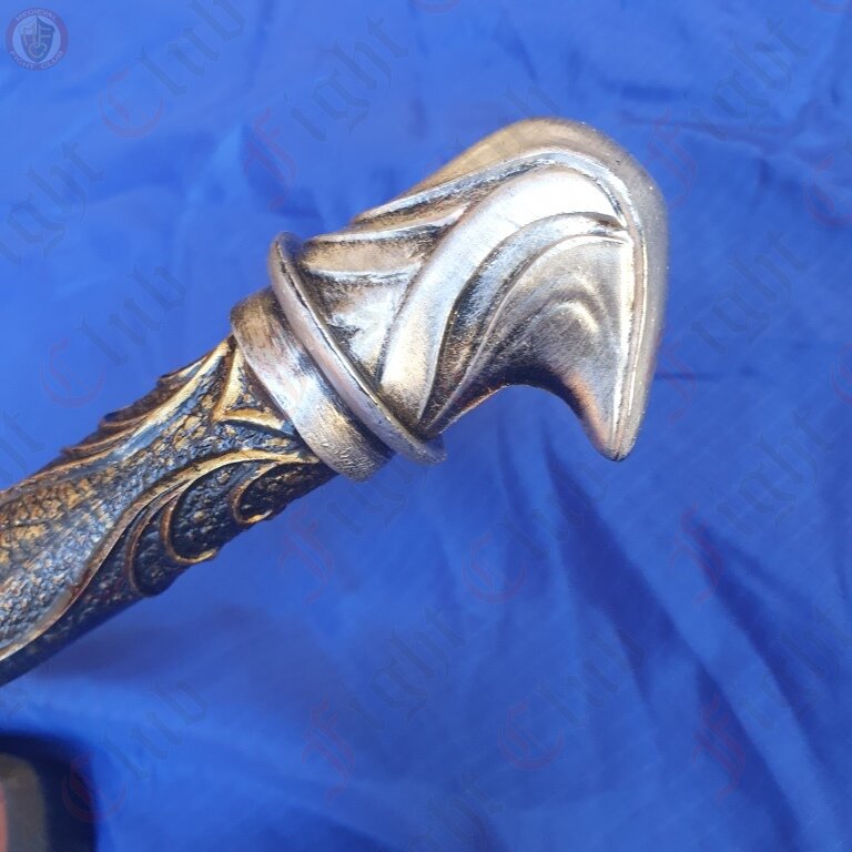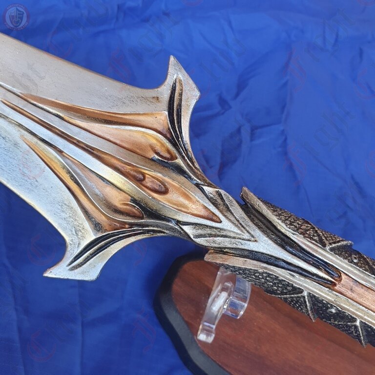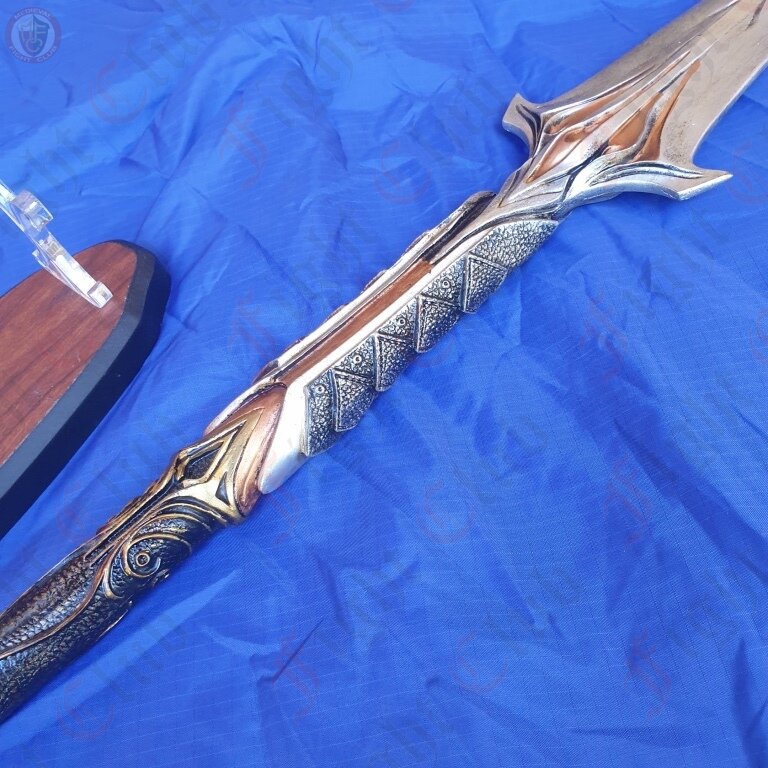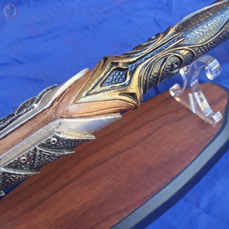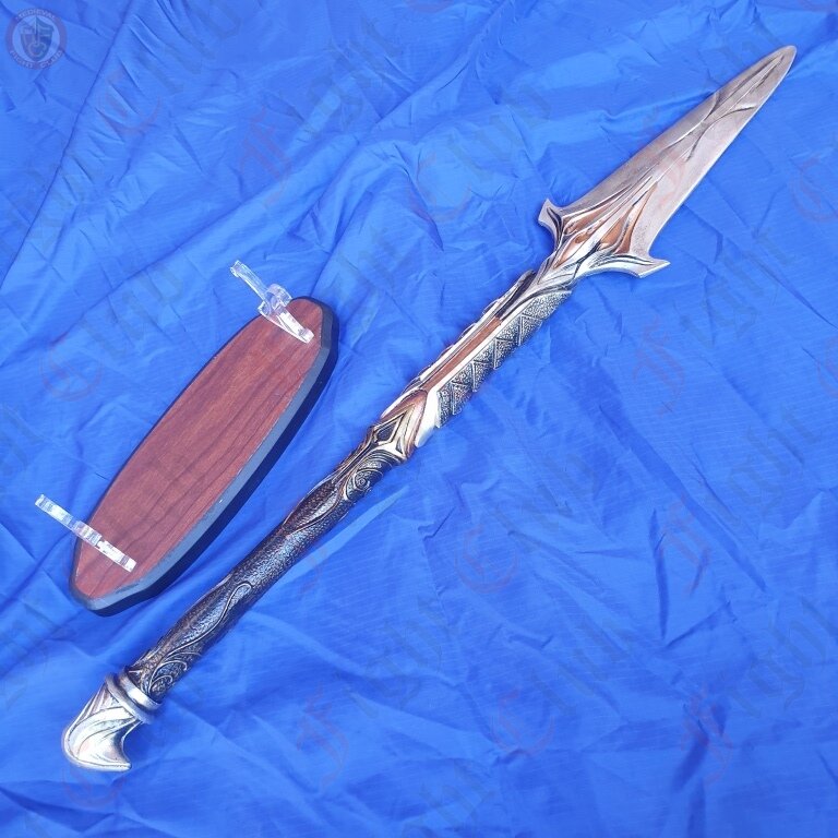 The spear is made from resin (not rubber) it is suitable for cos play and costume.It comes with a wooden/perspex stand for display purposes.