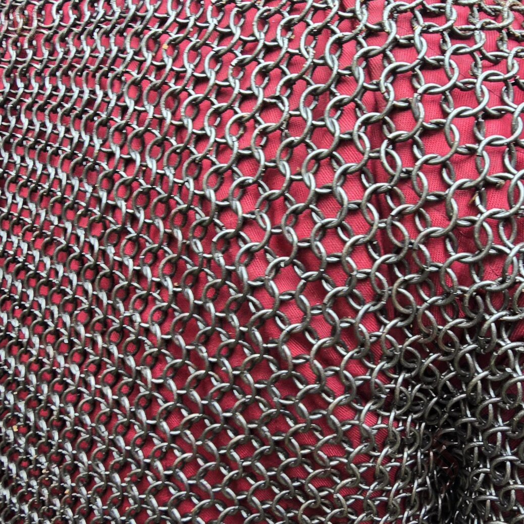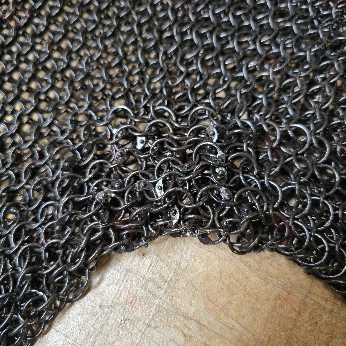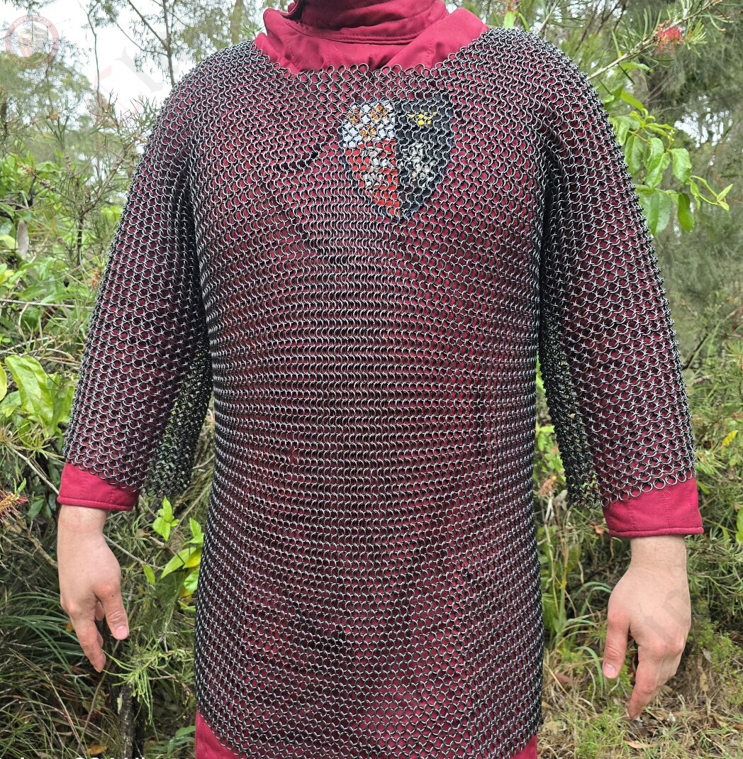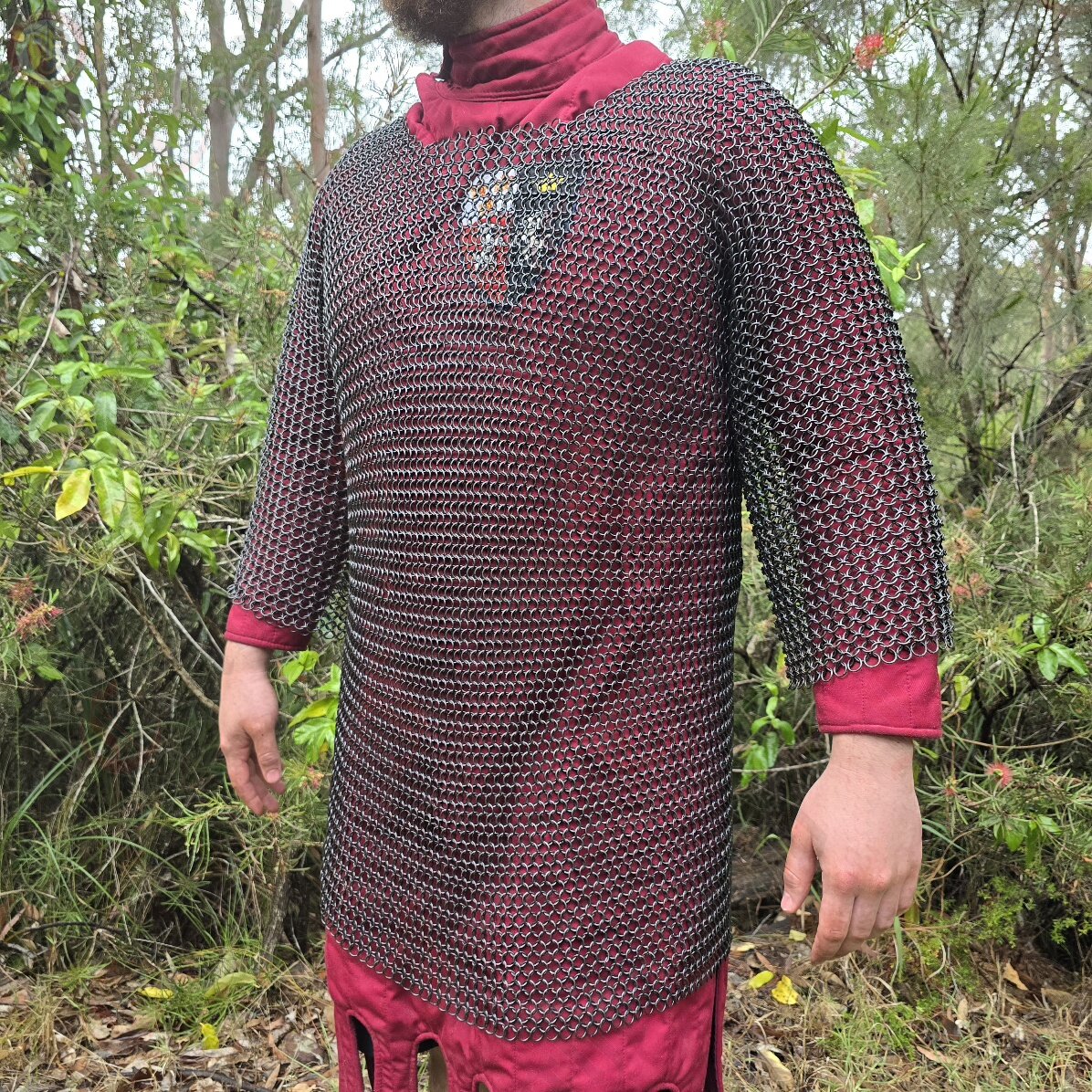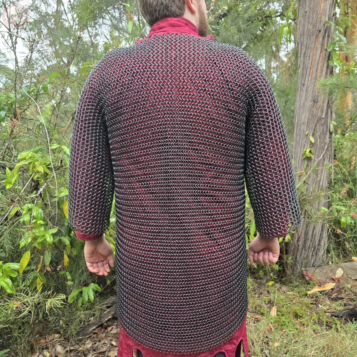Forged for the battlefield, this mail tunic is crafted from blackened mild steel rings linked in the classic 4-in-1 pattern. Built for strength and flexibility, the armpits are reinforced with riveted mail for extra durability where it counts.