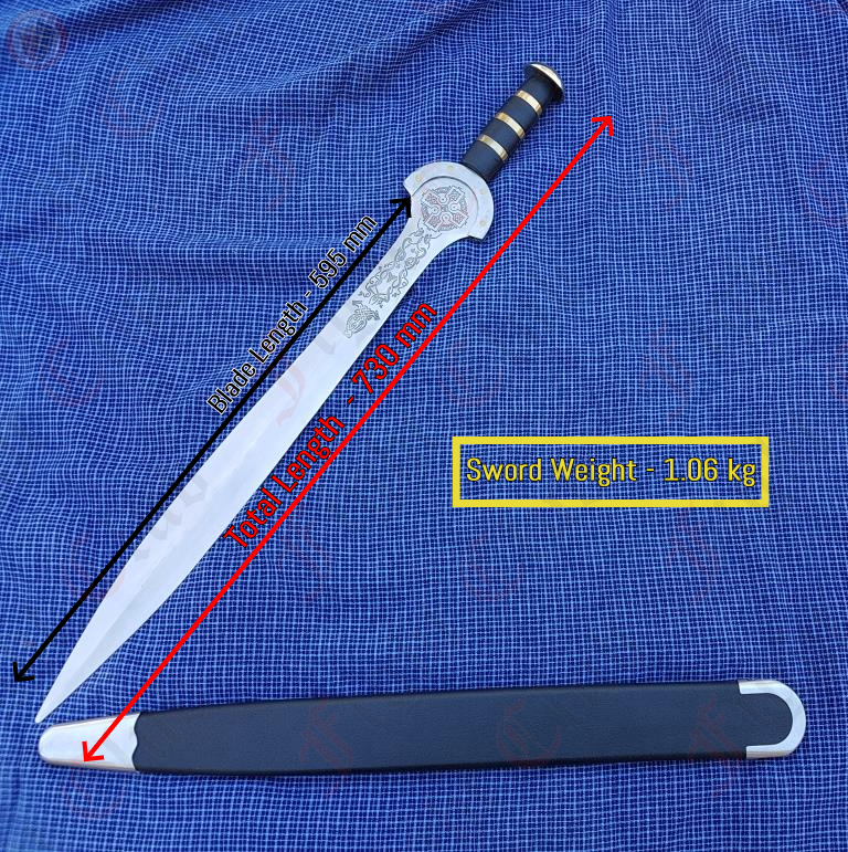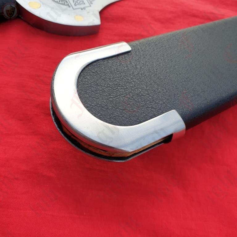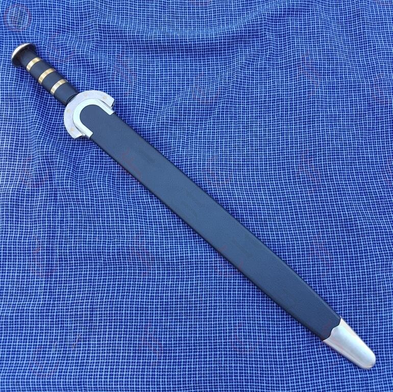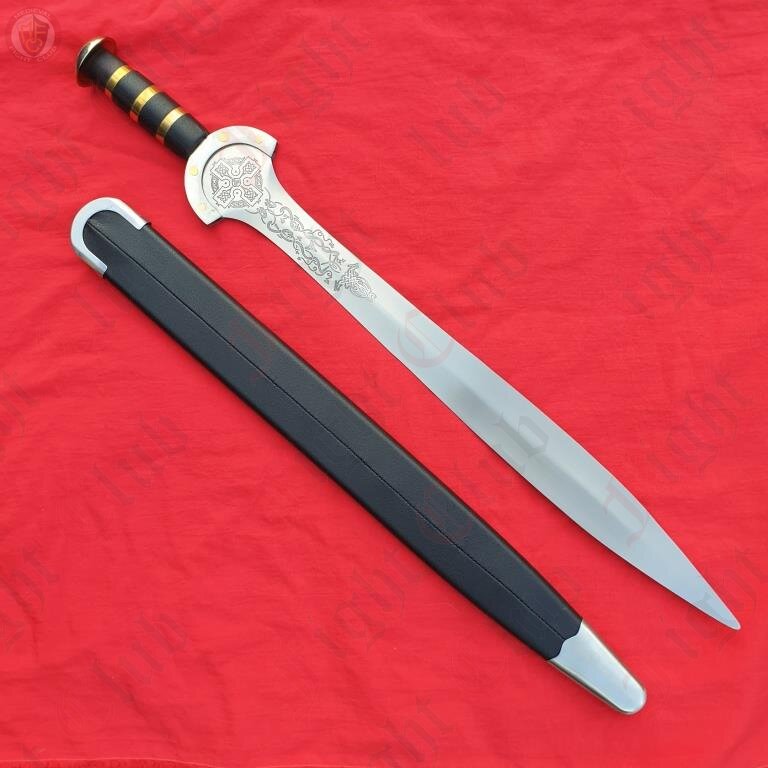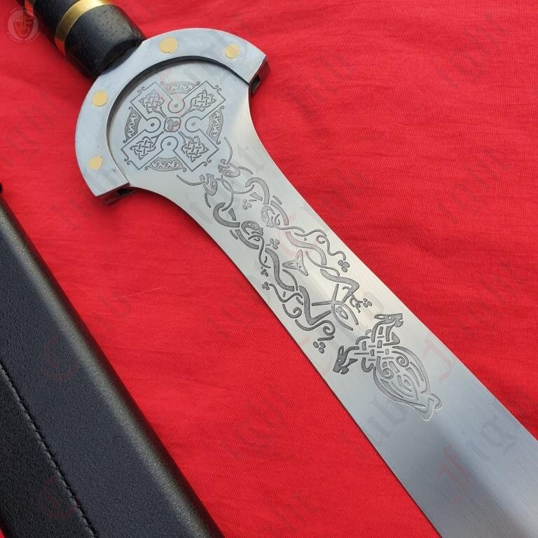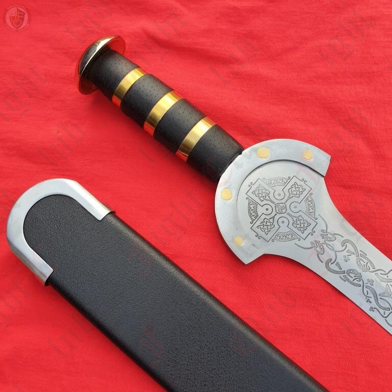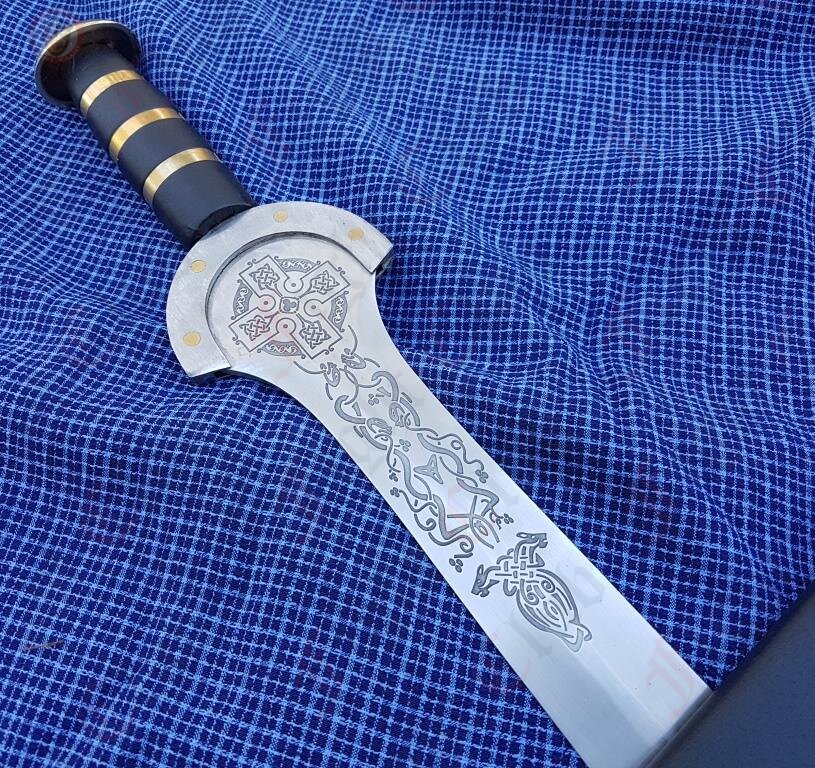 Luckily for us, this leaf blade is made of steel, and features no such weaknesses, and so the design is purely for style and aesthetics. This sword in particular features a Celtic Cross and anthropomorphic knotwork pattern etched onto the blade. The grip is black leather with brass bands and a brass pommel. It comes complete with a black leather scabbard and steel fittings.