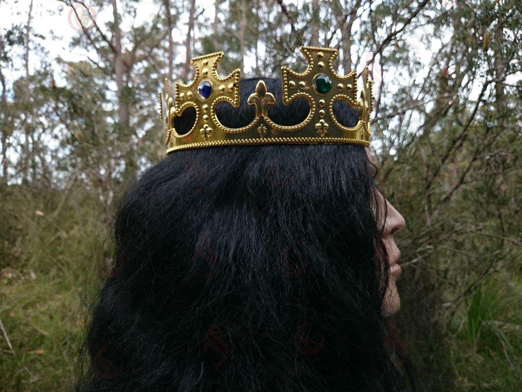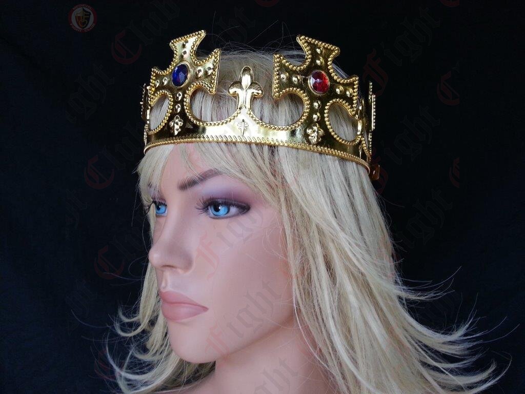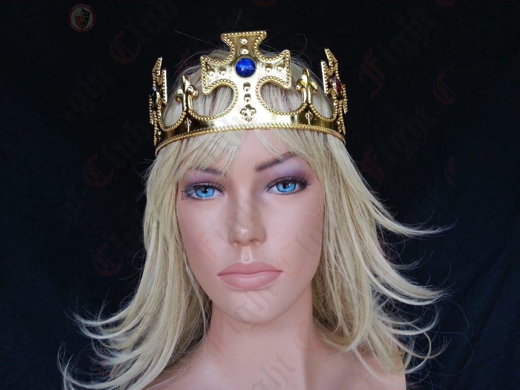 A plastic Princely Crown in gold finish with multicoloured gems.
