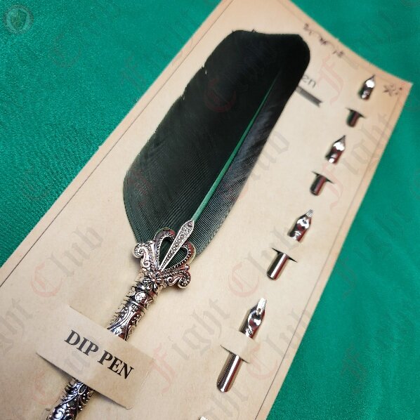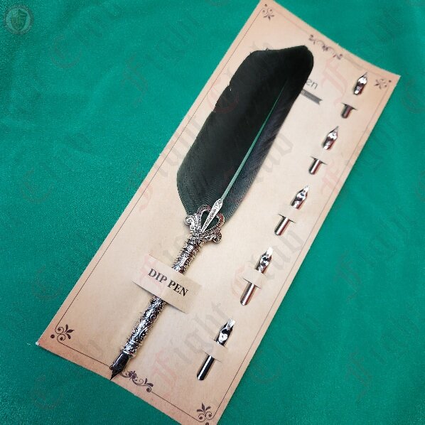 This quill is made from a dark green feather, silver coloured metal cylinder and comes with an array of 6 steel nibs. It measures approx. 25cm overall with the steel cylinder & nib measuring 8.5cm in length.