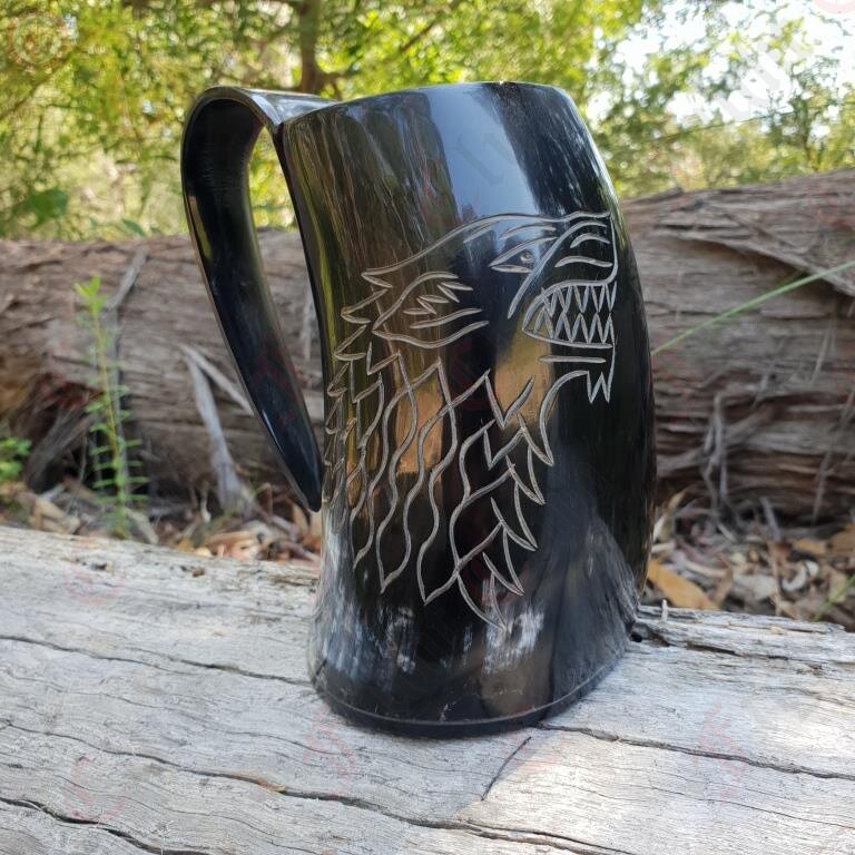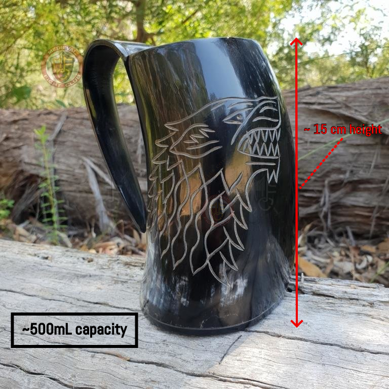 Clean & polished with a horn base, this tankard features the Dire Wolf sigil engraved on one side. This is a very large drinking tankard with approx 450 mL capacity, Plenty of room for mead or beer - a mug fit for any King or bastard of the north!
