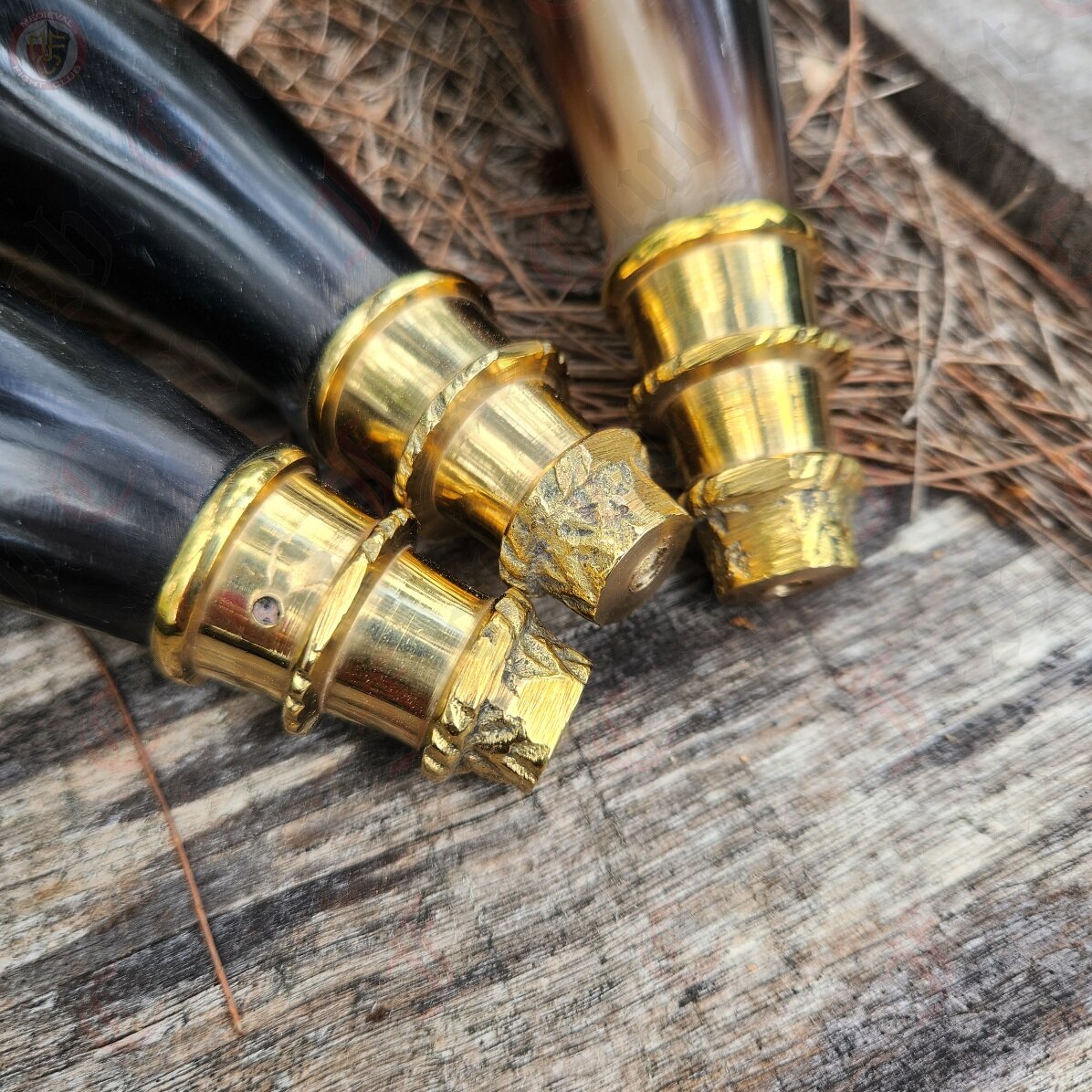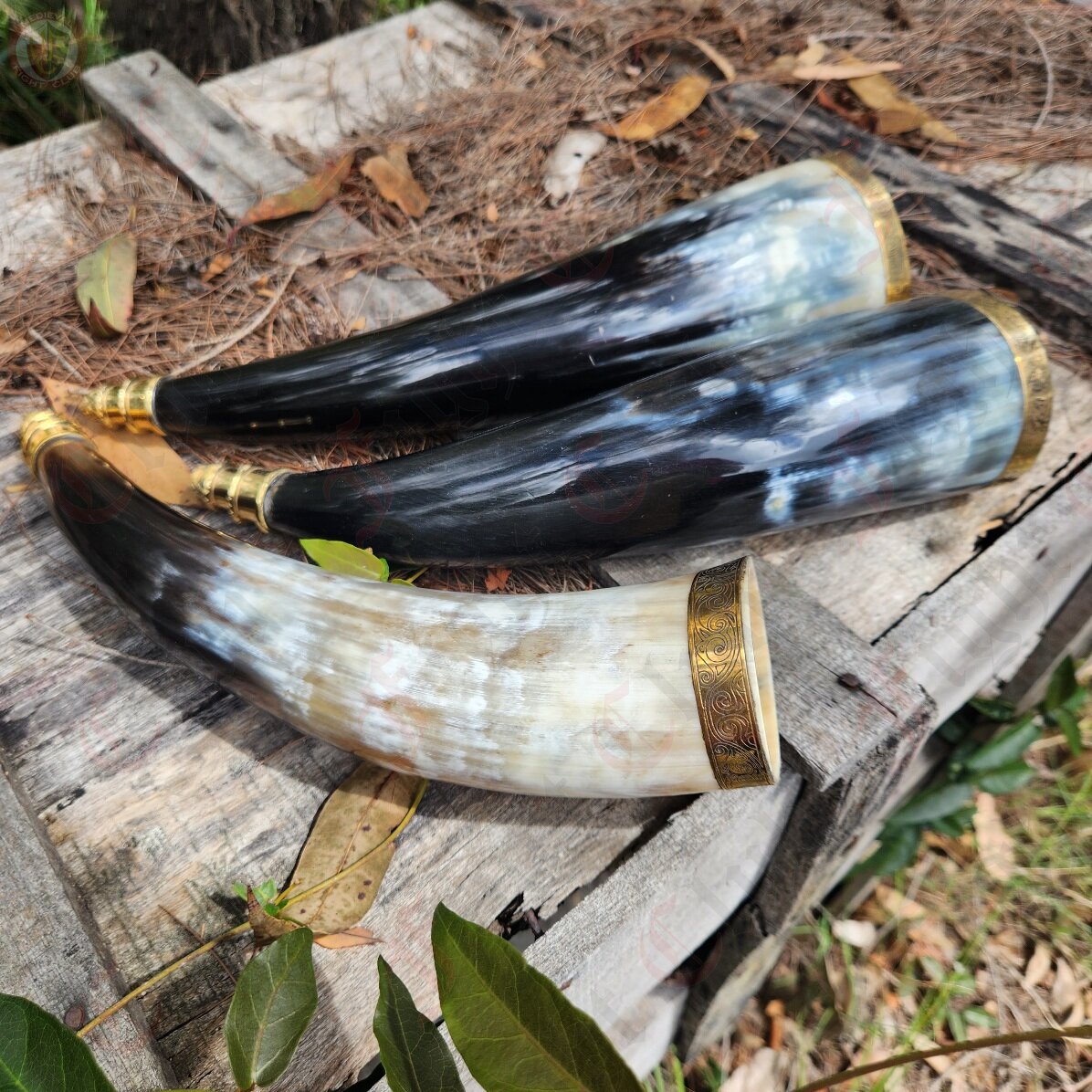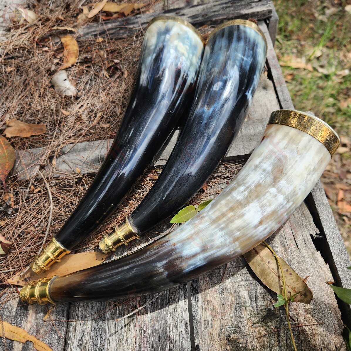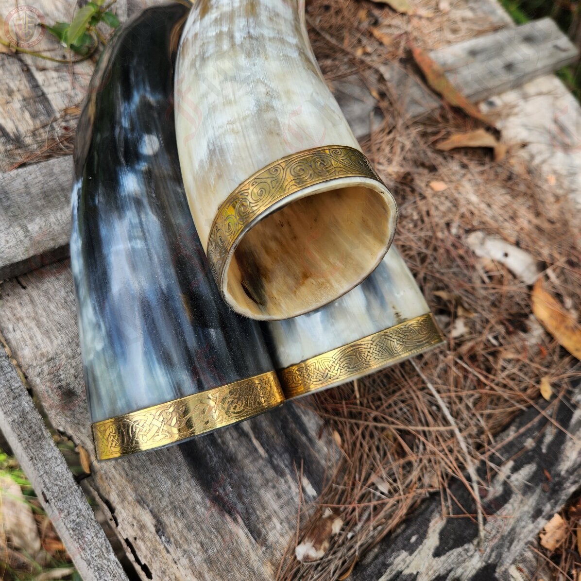 Drinking horn with brass rim (pattern may vary) & brass finial - approx. 35cm (14 inch) along the curve with a 15.5-21.5cm (6-8.5 inch) circumference.
