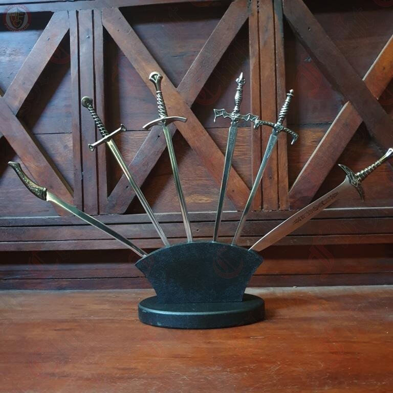 A collectors' set of six letter openers with a wooden stand. Each sword is made from stainless steel and will not tarnish.