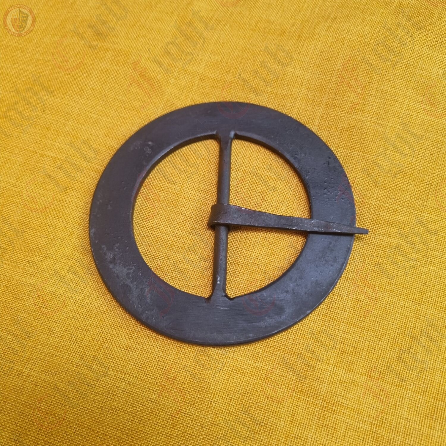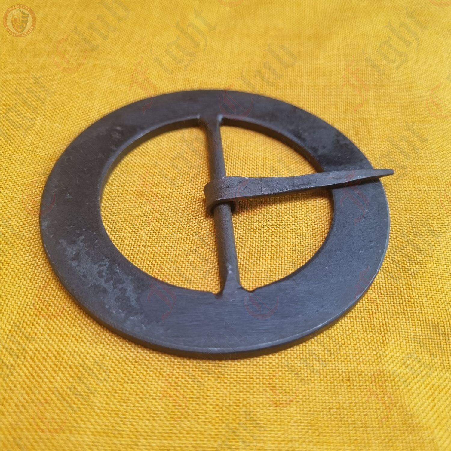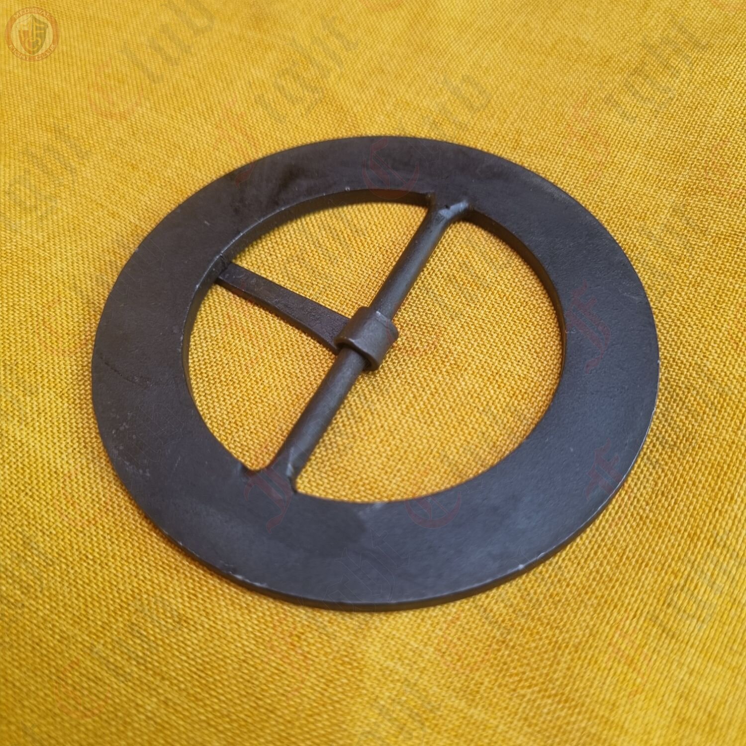 A large wrought iron belt buckle, styled to be a complete flat circle. Ideal for large belts or armour straps, either decorative or practical.