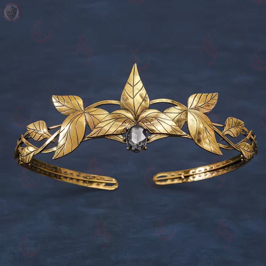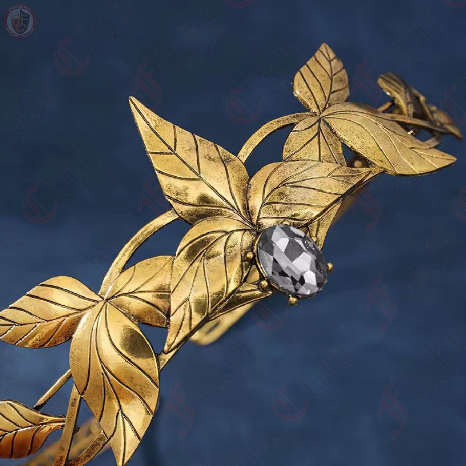 A gold coloured leafy crown with and faux grey onyx gem for Elven nobles or royalty.