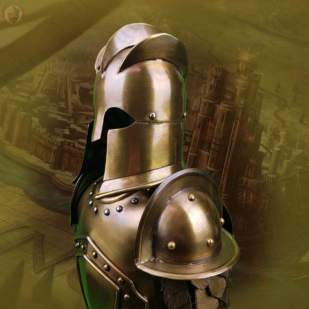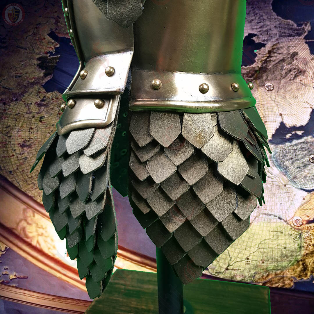 The Kings Guard Armour is a scale replica ornament based off of the iconic armour worn by the Kings Guard in the Game of Thrones television series. The Kings Guard were the personal soldiers of the royalty in Kings Landing, the court of the Iron Throne. They wore a full cuirass, with segmented scale armour on the legs and waist, and a distinct three-pronged barbute helmet.