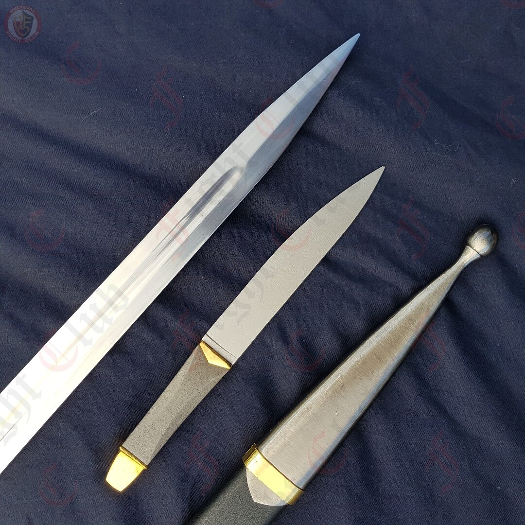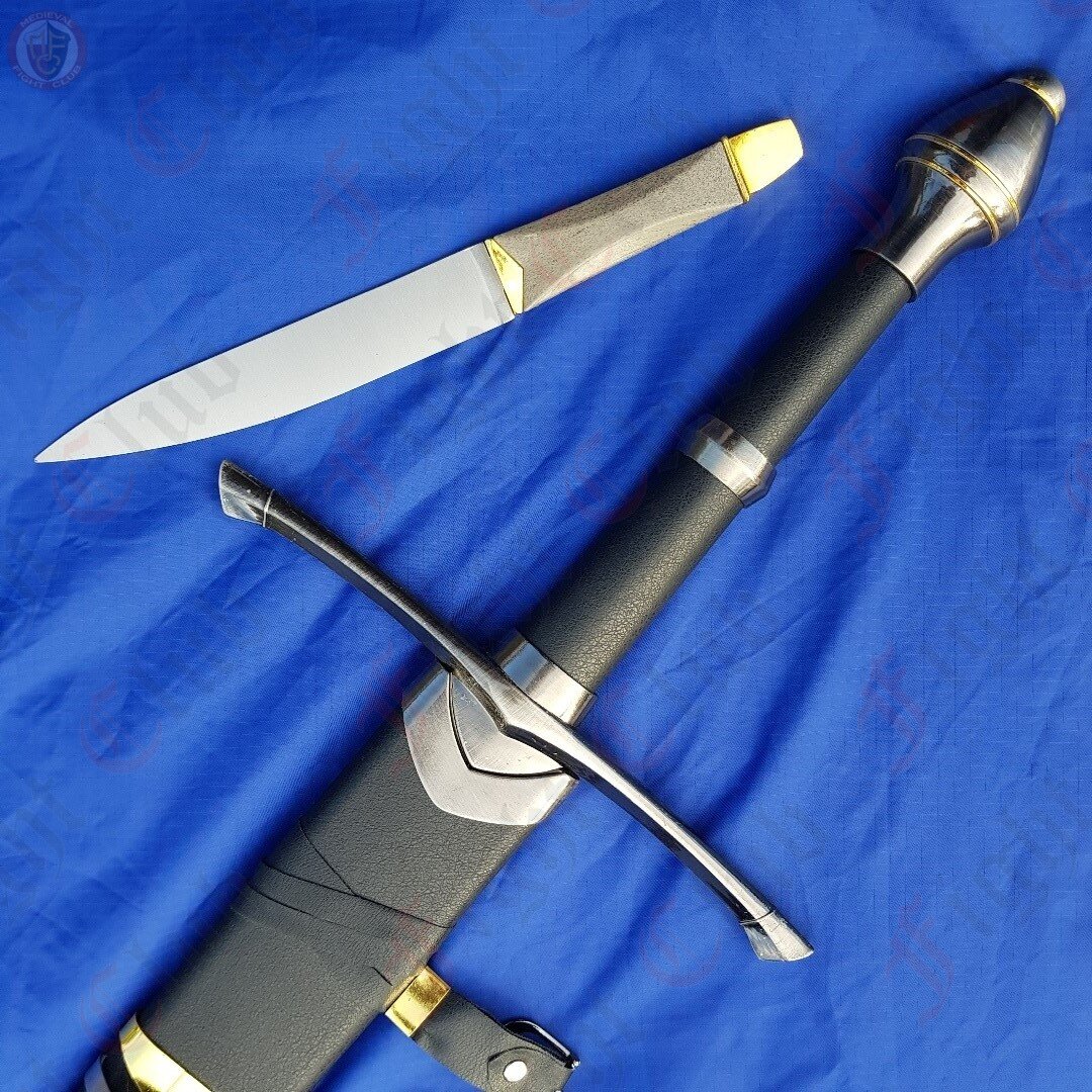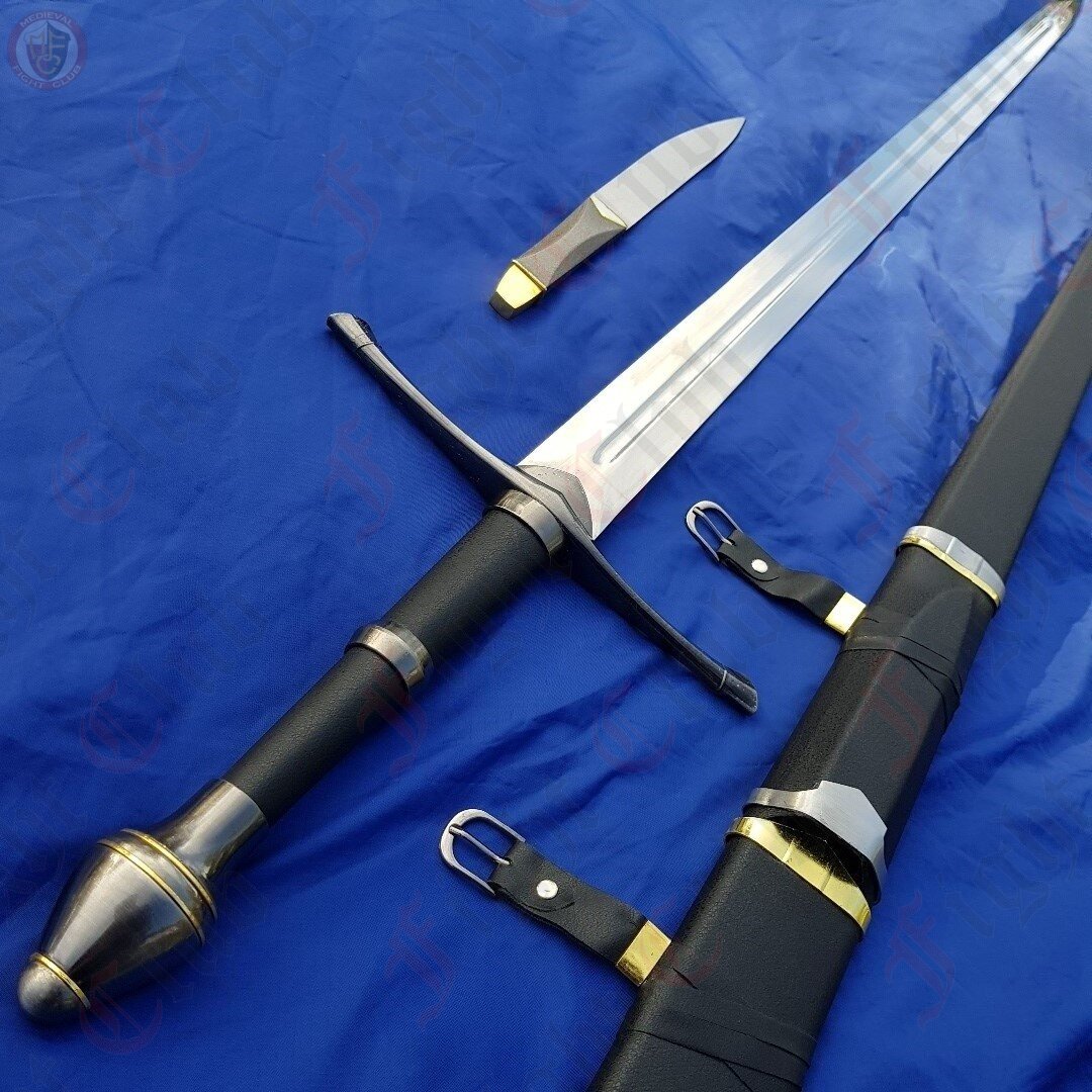 Based on the sword wielded by Aragorn in the Lord of the Rings movie trilogy. The sword is later replaced by Anduril. The scabbard of the sword has a slot partway down its length for the small hunting knife included. The scabbard includes two buckles to be attached to a belt or harness.