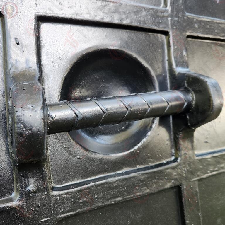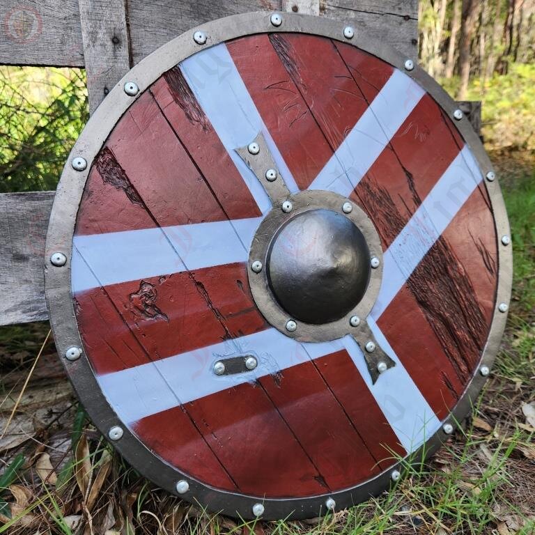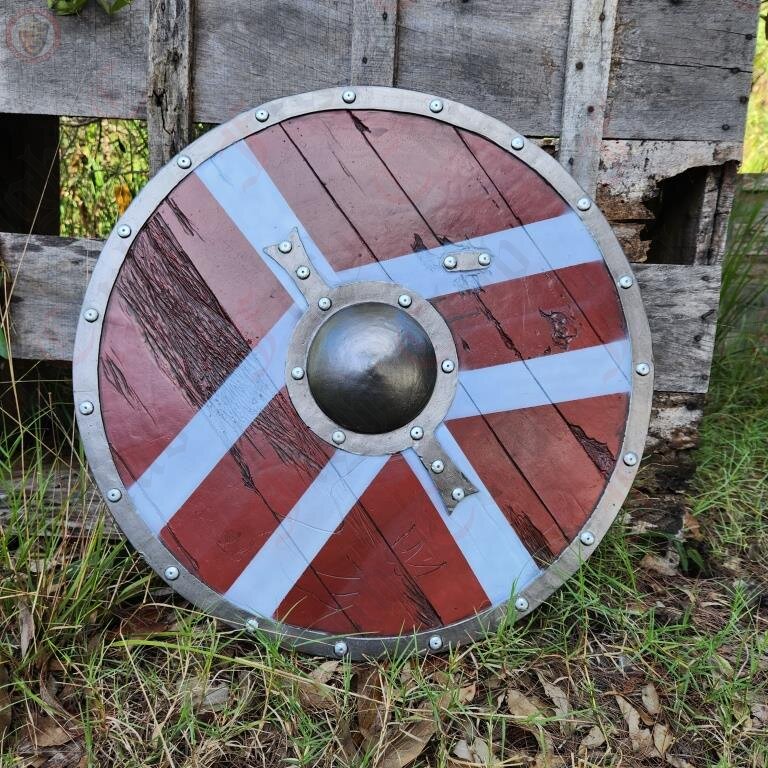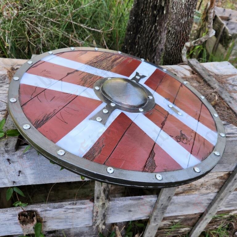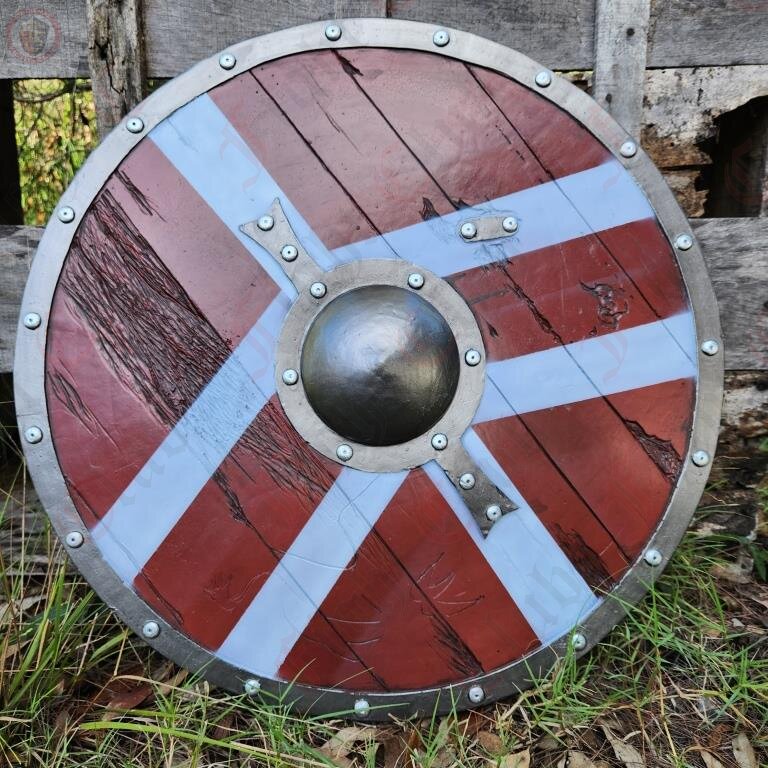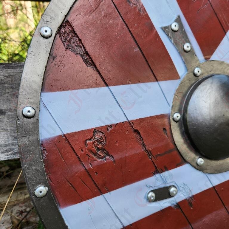 This round rubber shield features a chevron pattern paint job, wood facade, rivets and boss. It is reinforced and has a sturdy punch grip on the reverse side, and features some decorative battle scarring on the wood front.