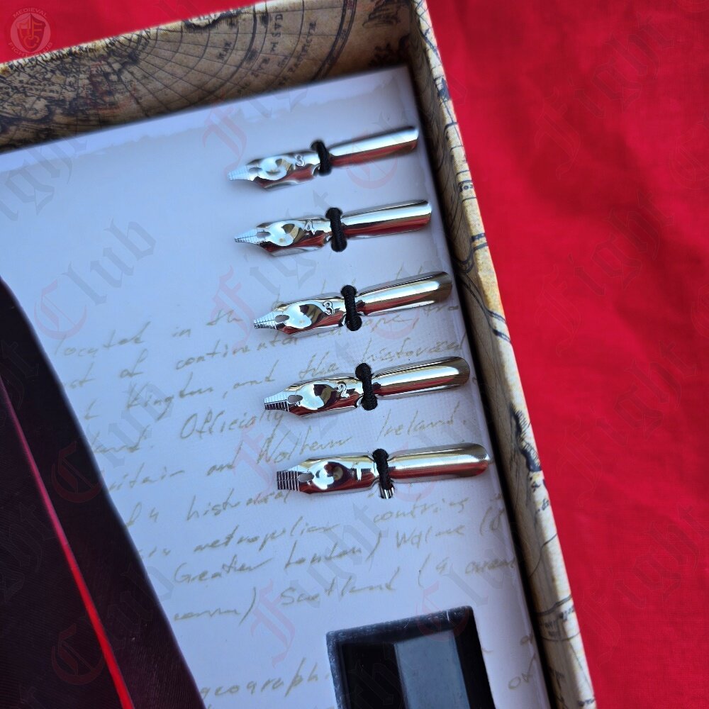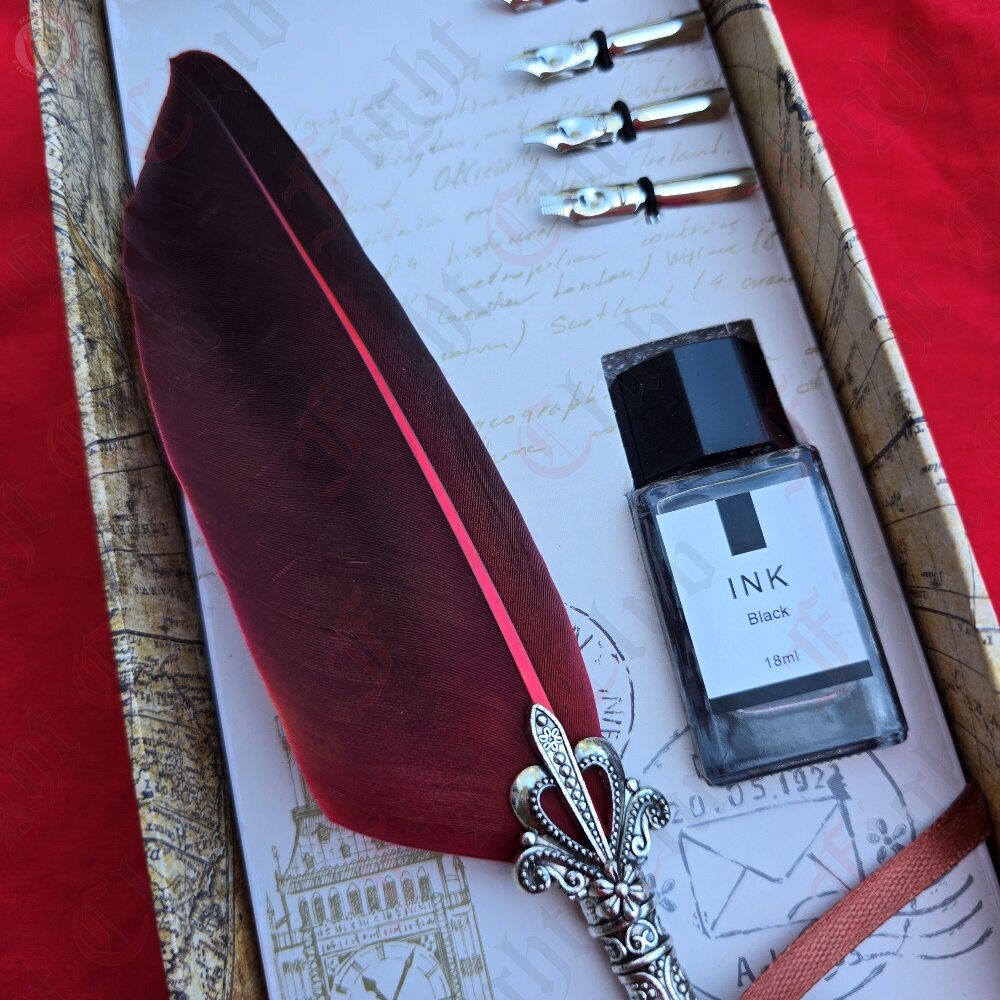 This set features a vibrant red feather paired with a silver-coloured metal shaft, along with six interchangeable steel nibs for a versatile writing experience. Measuring approximately 25cm in length, it also includes an empty ink bottle for safe transport and easy storage.