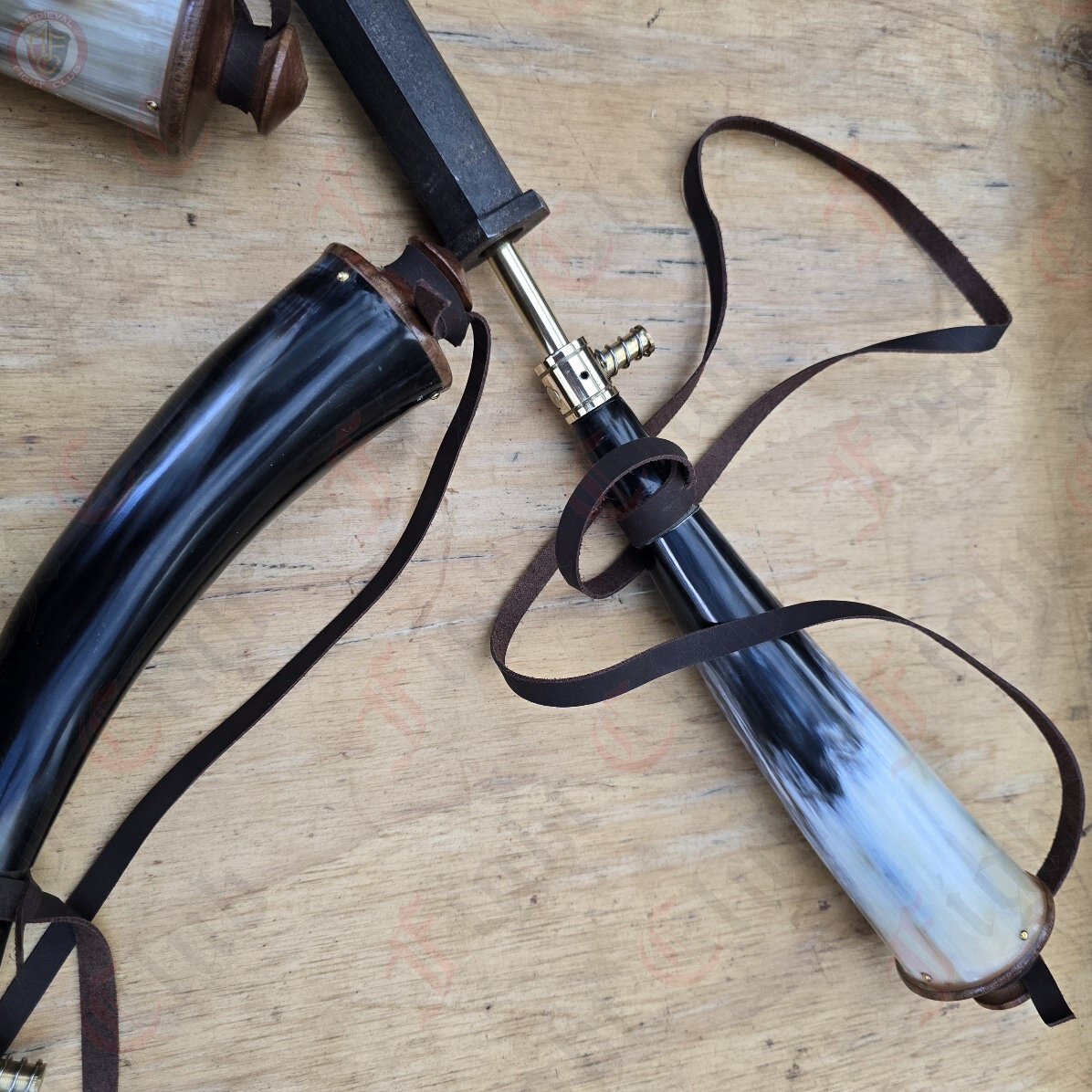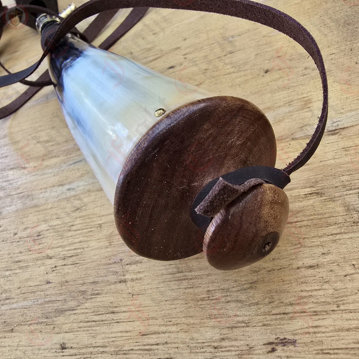 This replica powder horn is made from natural horn and comes with a wooden cap, and a brass pourer offering an authentic look and feel of a period-specific piece.