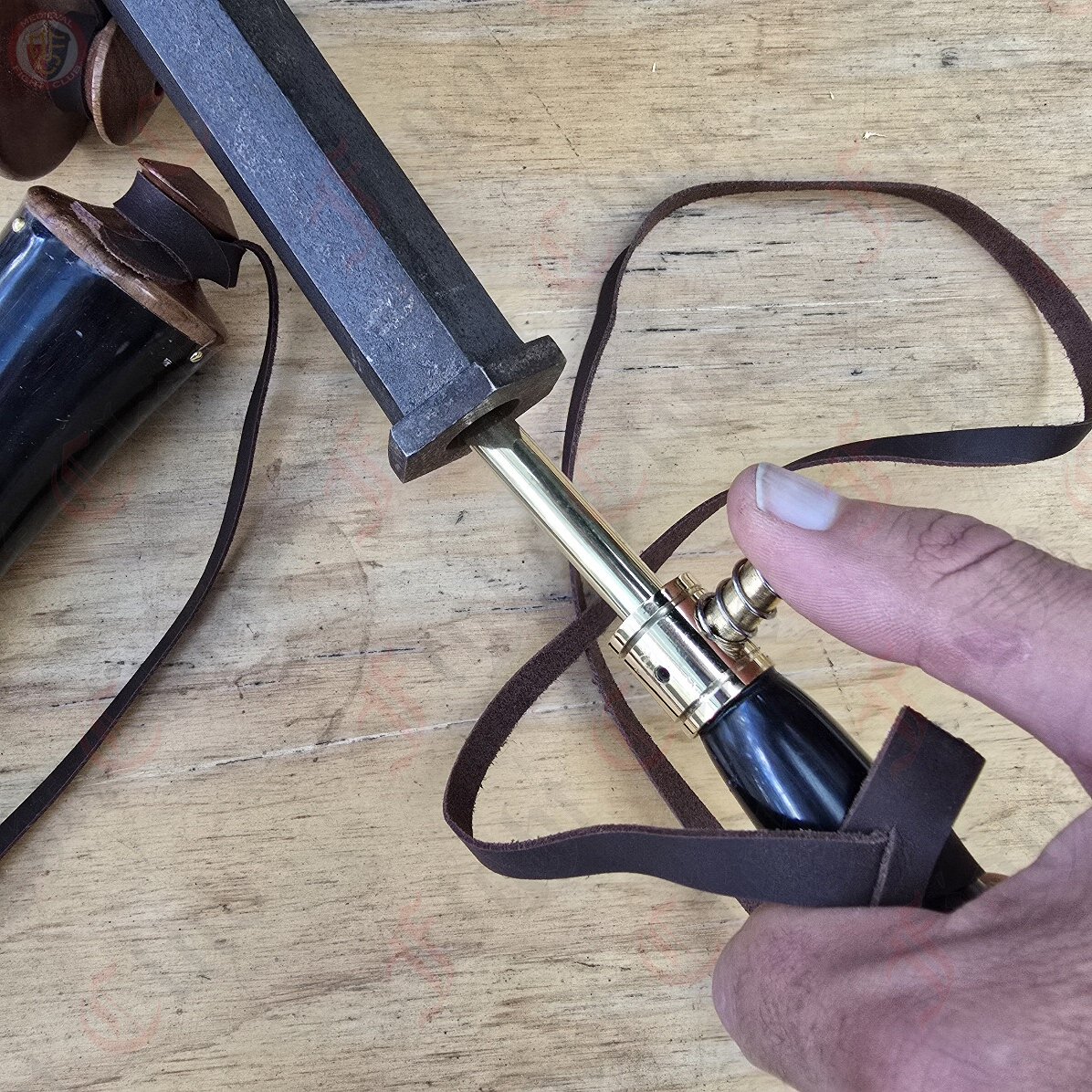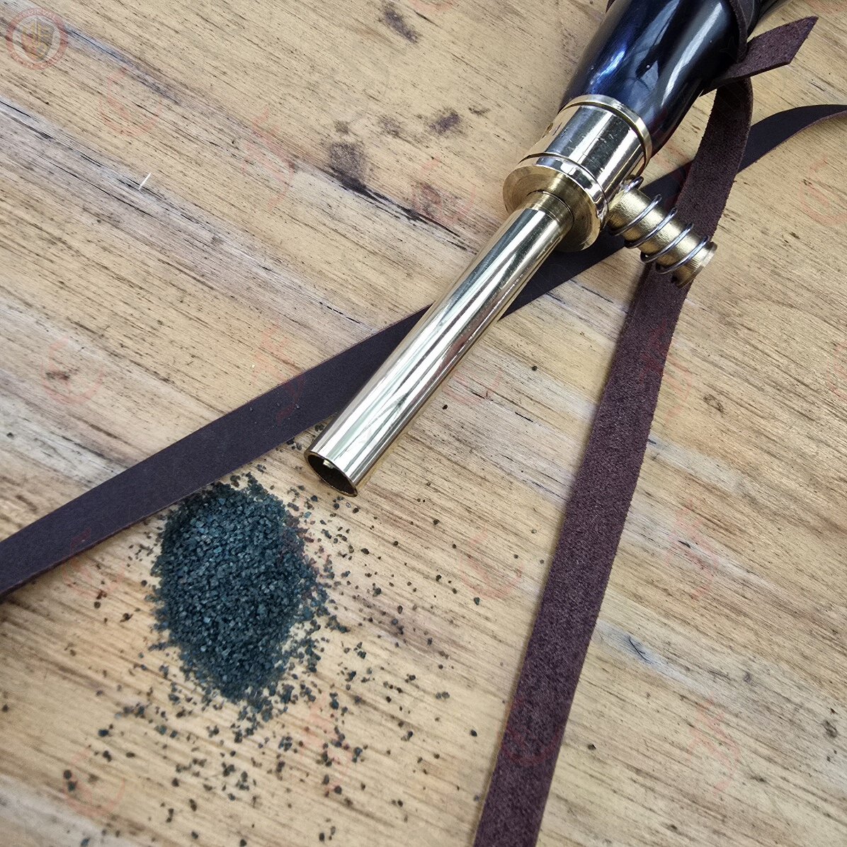 A powder horn was a vital accessory used to carry gunpowder, typically crafted from the horn of a cow or buffalo. These horns were a common sight during the 17th and 18th centuries, particularly for soldiers, hunters, and settlers who relied on muskets for hunting and defense. The powder horn was designed to be both durable and portable, allowing users to carry their gunpowder securely while also providing a way to measure and pour the powder into their firearms.