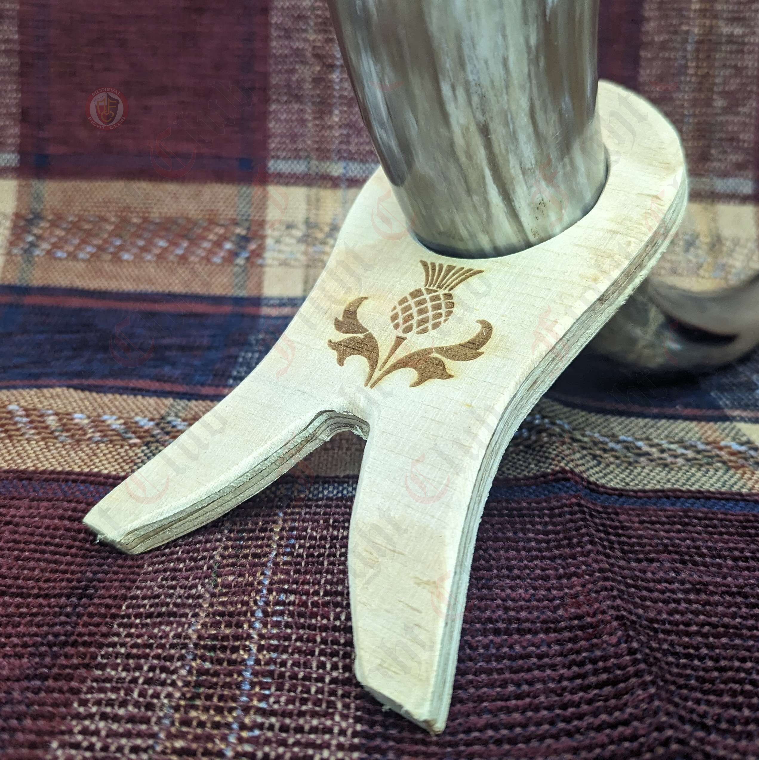 It has been designed to work with almost any horn size. Horn stands are required at feasts and gatherings where people will be using a horn to drink from.