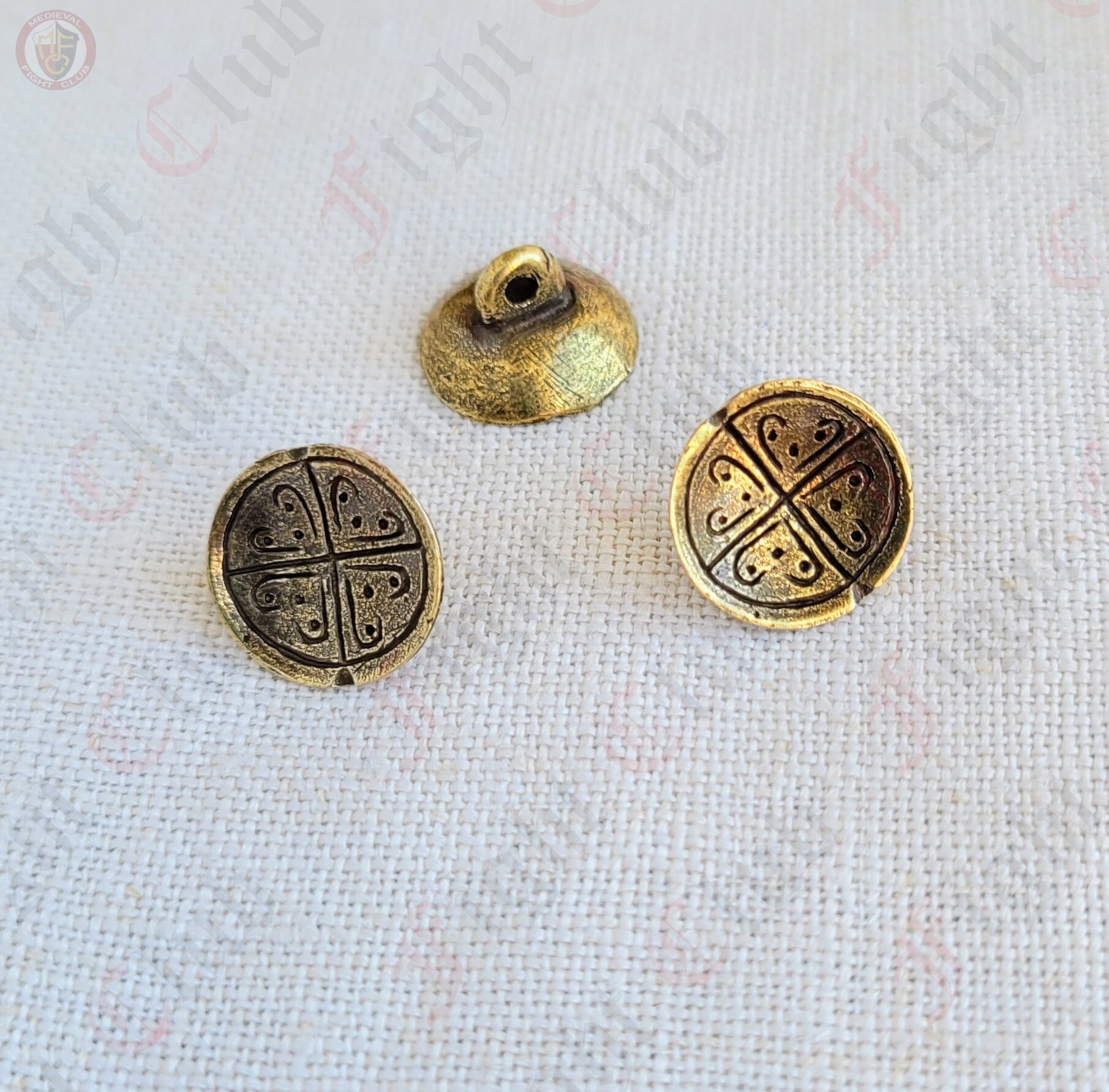 Our antique shield with cross pattern buttons each have a loop to attach to a garment.