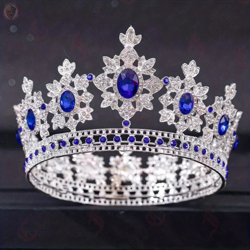 A silver coloured crown with crystal and blue (sapphire like) glass, perfect for every King or Queen who love the colour blue.