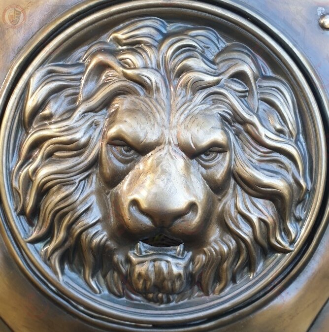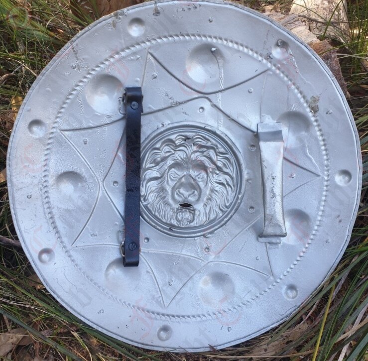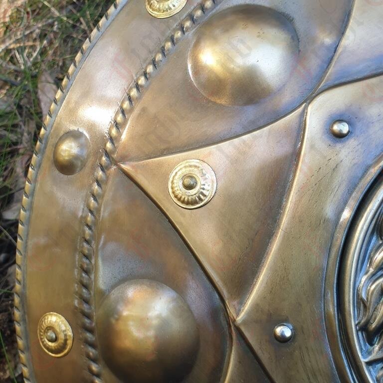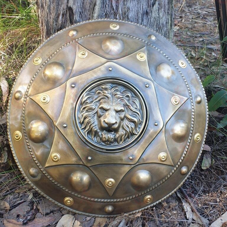 Round steel shield featuring a fearsome battle lion inside a seven pointed star. The shield is painted bronze/gold and is embossed with rope work and adorned with brass discs.