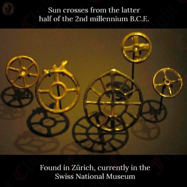 A sun cross, solar cross, or wheel cross is a solar symbol consisting of an equilateral cross inside a circle. It is a ubiquitous design in the symbolism of prehistoric Indo-European cultures, such as those from the Neolithic to Bronze Age periods. The symbols prevalence and supposed import in prehistoric religion has promoted the theory that it is a representation of the sun, hence its name 'sun cross' from the German Sonnenkreuz. It is also interesting to note the similarities between the sun cross and a wheel, such as those on the chariot of Helios, the Greek god of the Sun. Another fun note is that the sun cross symbol means 'village' in Ancient Egyptian.