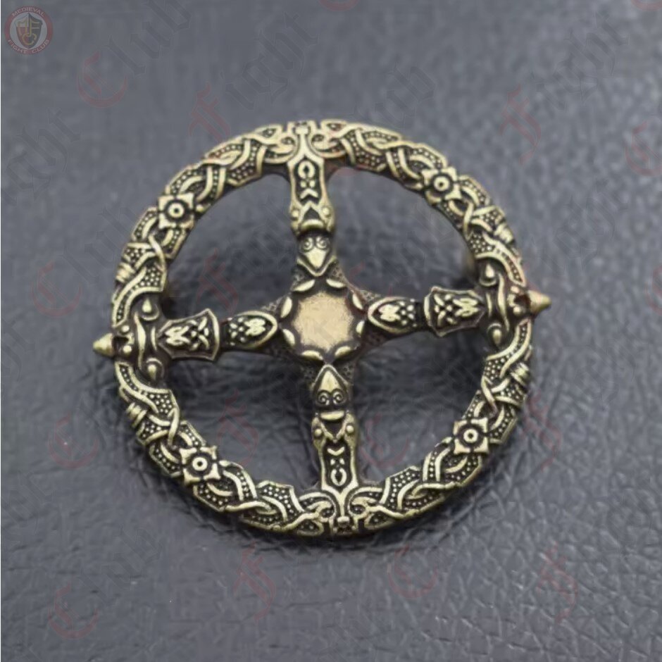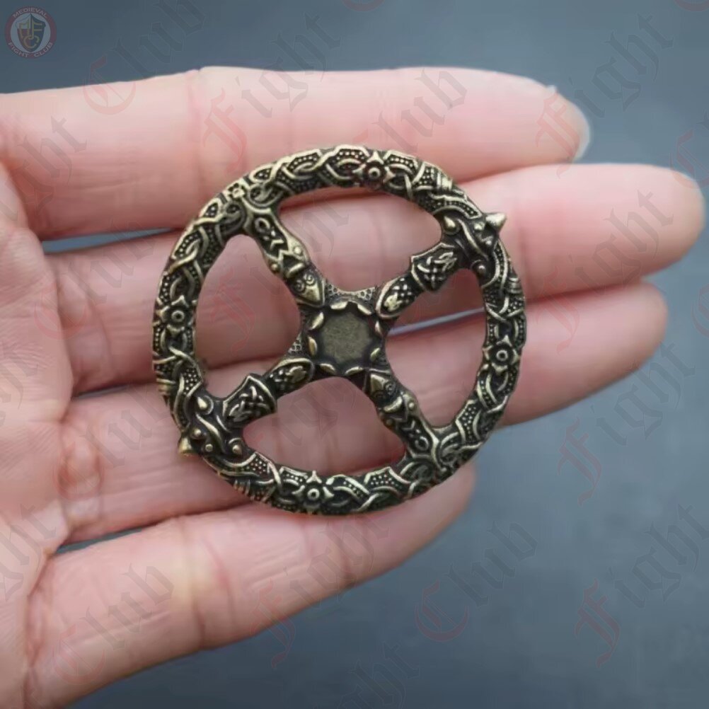 This brooch is detailed in a more intricate pattern than its Bronze age predecessors. It features dots, swirls and symbols fine imprints to add to its decorative nature. It also features a modern brooch pin for ease of attachment to your lapels, bags or other clothing.