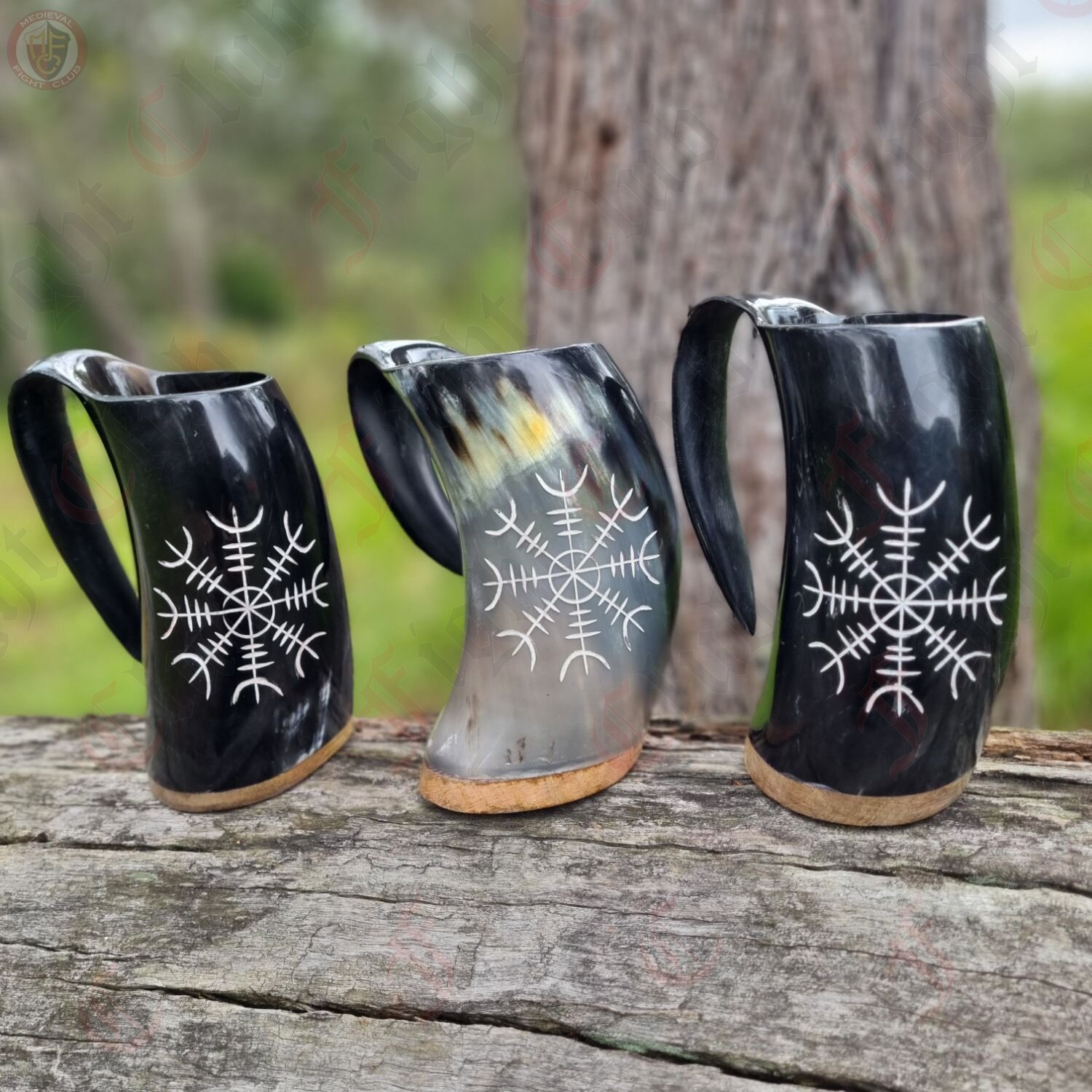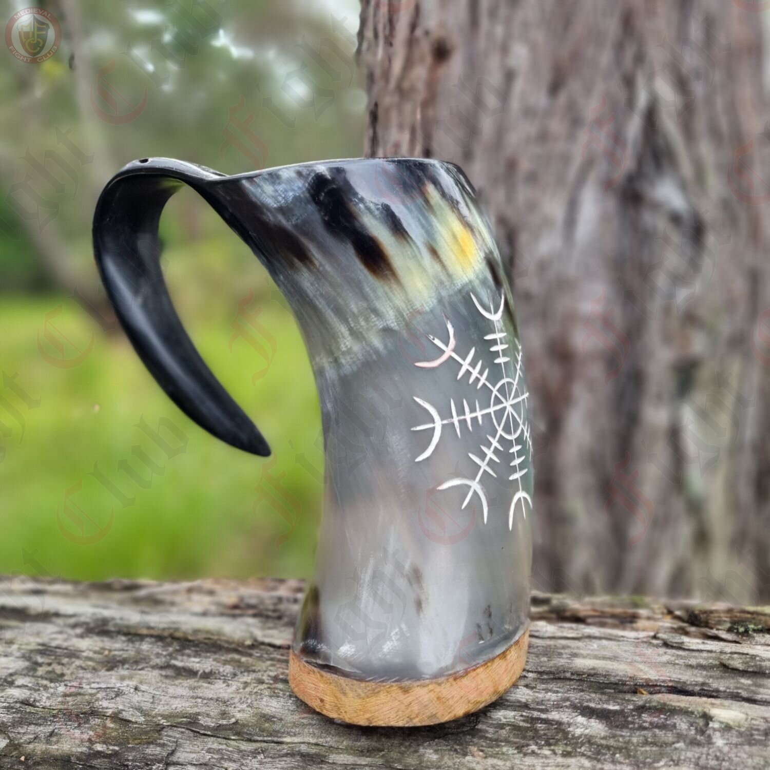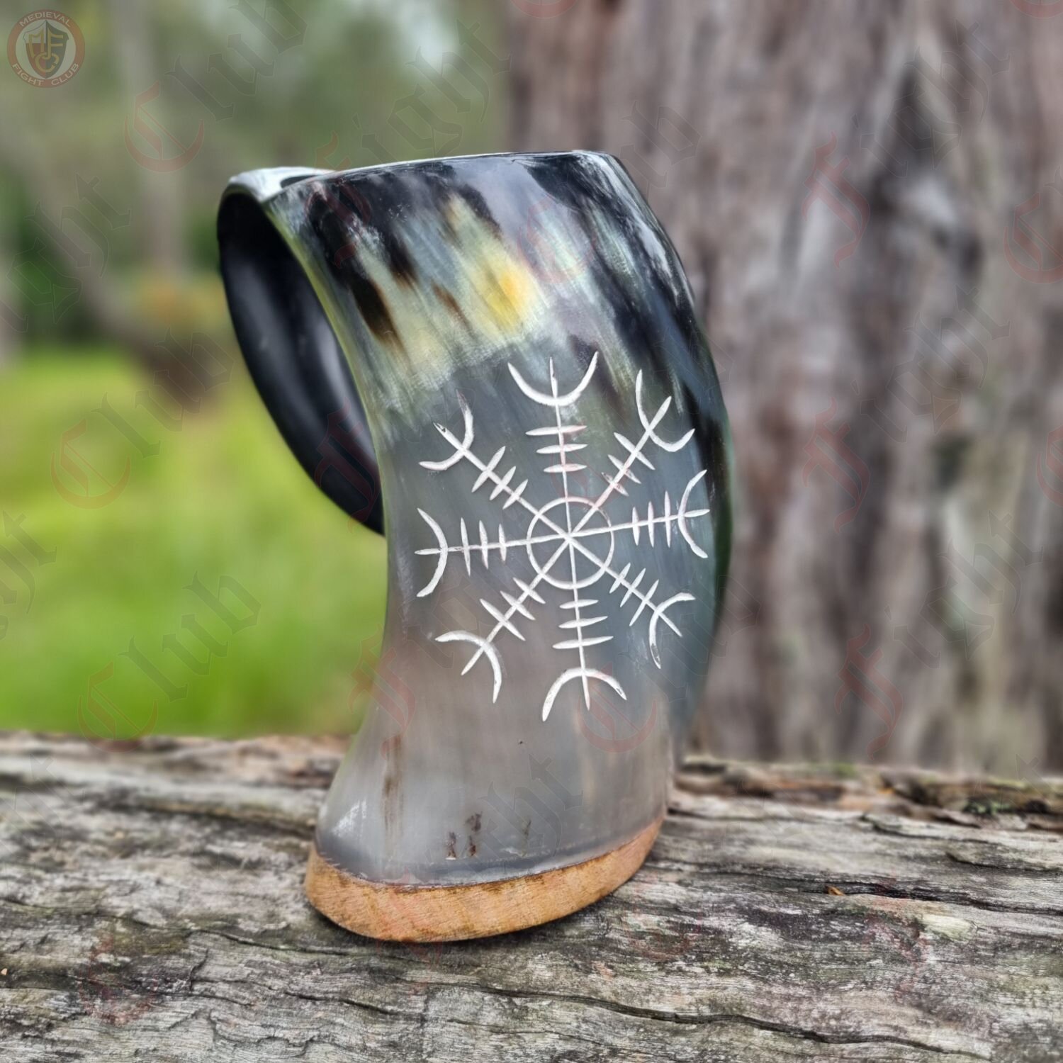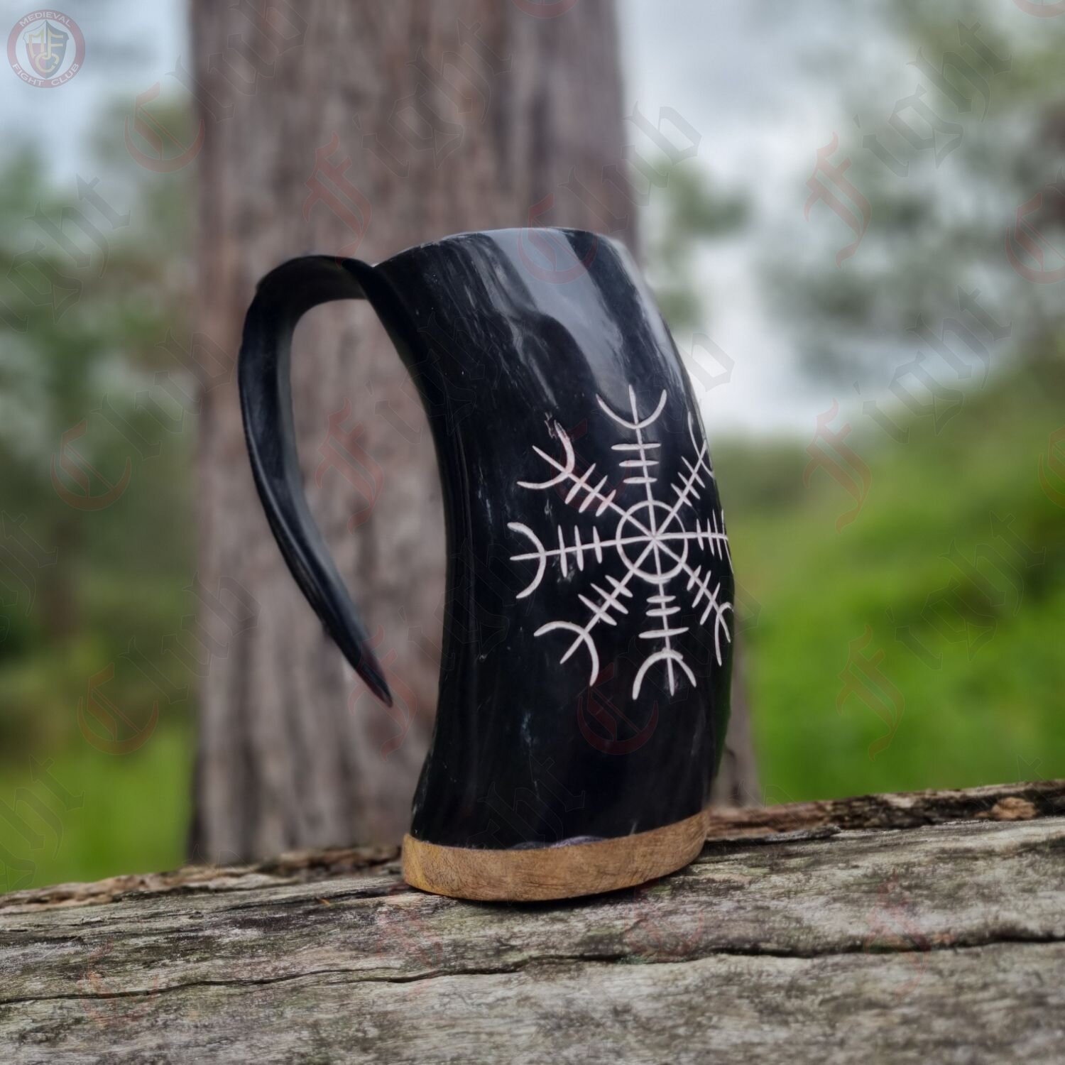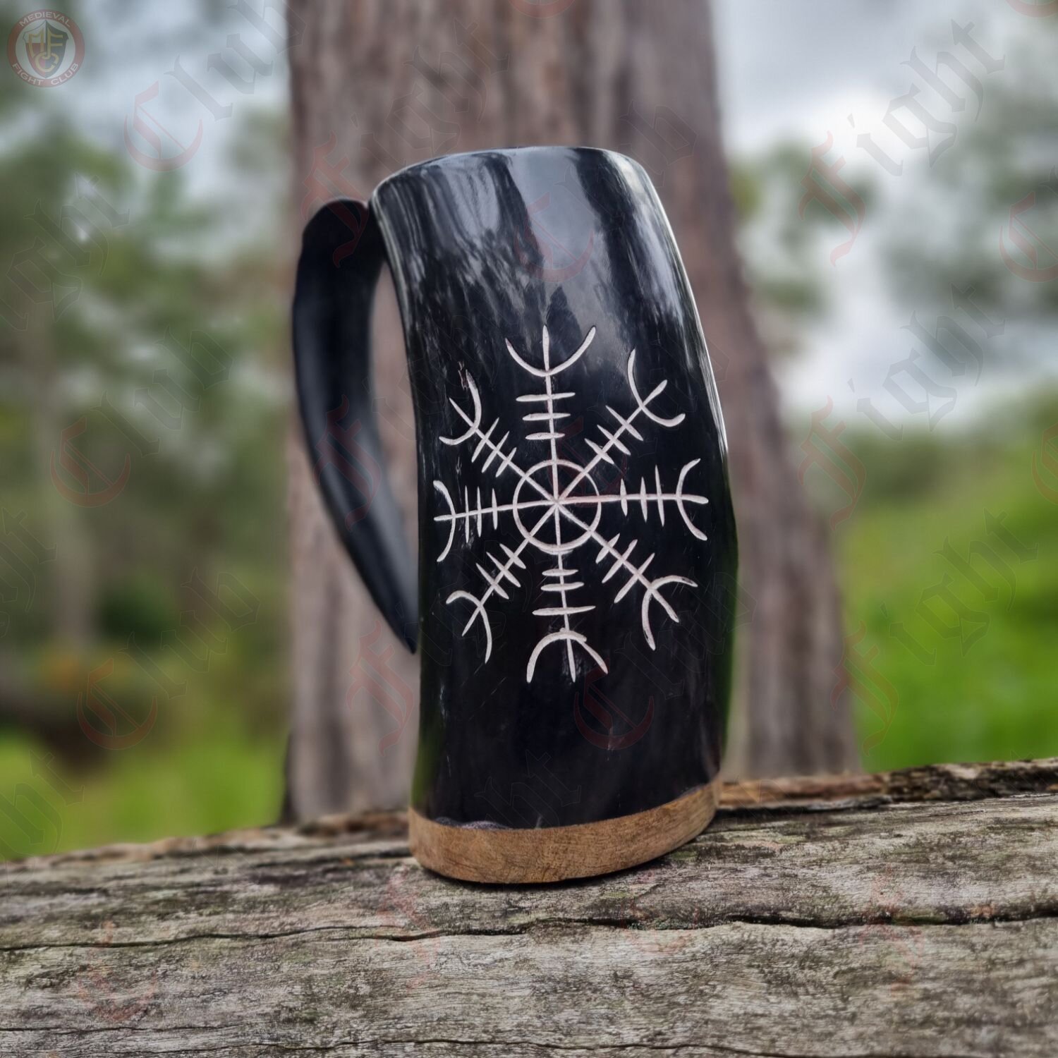 Raise your horn with power and purpose. This handcrafted 500ml tankard is engraved with the Helm of Awe (Ægishjálmr)—a legendary Norse symbol of protection and strength.