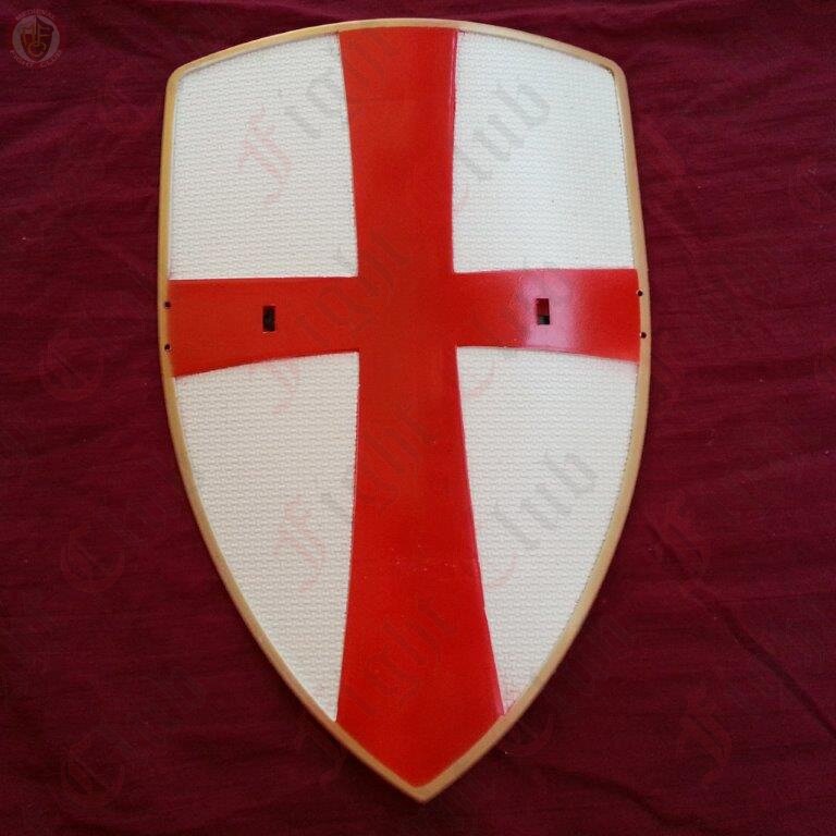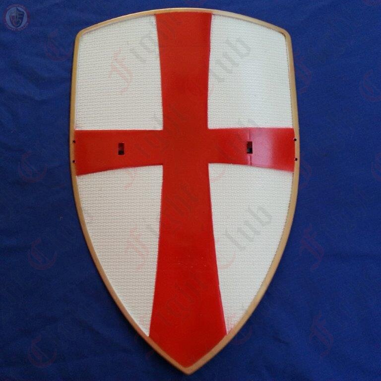 A holy crusader shield in a Templar style. Crusader shield is painted with the Templar colours of a red cross on a white background. It is made of plastic, is lightweight, and at this price is almost disposable.