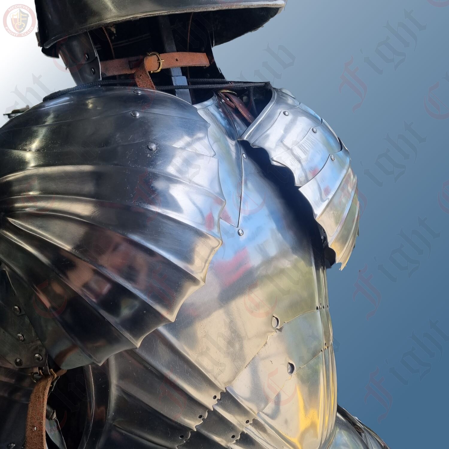 Full Gothic German Cuirass - a full breastplate, plackart, backplate, faulds and tassets, covering your entire torso with durable 1.6 mm steel. With flutes and articulations, the cuirass allows for excellent freedom of movement whilst still offering top notch protection.