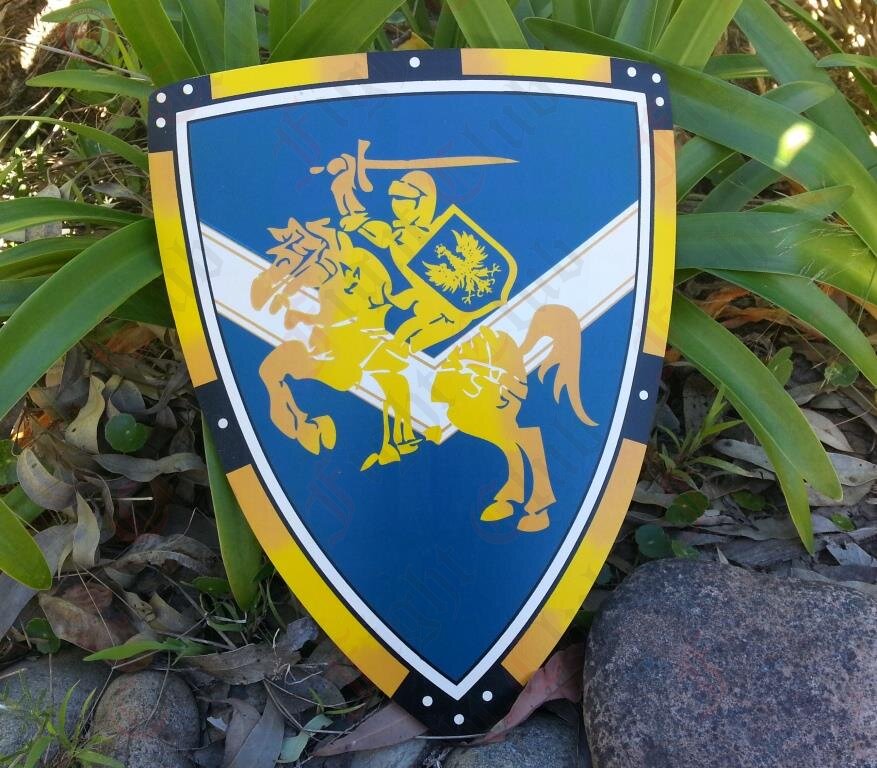 Light weight plywood curved toy shield with a knight on horseback on a blue field.