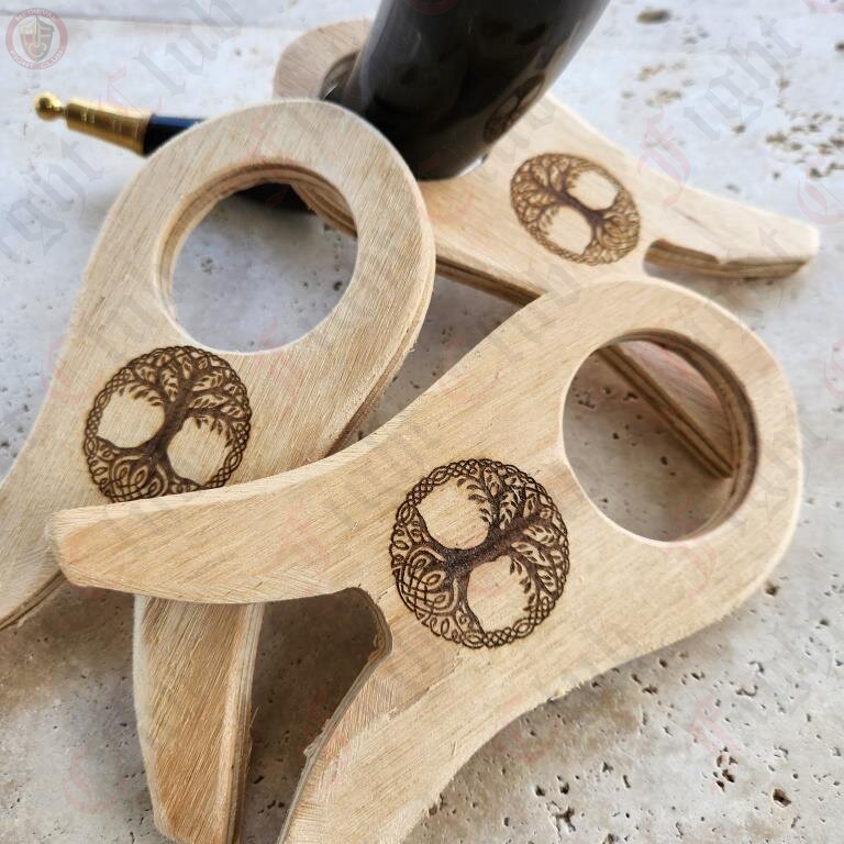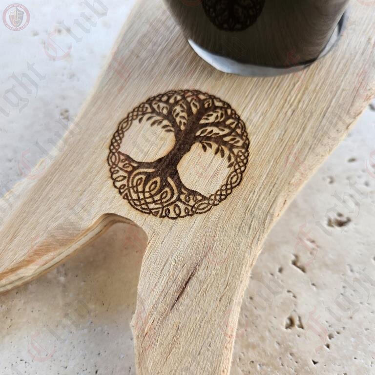 This horn stand is made from 100% sustainable Australian pine right here in Australia in the Fight Club workshop. After sanding we burn this intricate Tree of Life pattern straight into the wood (one side only).
