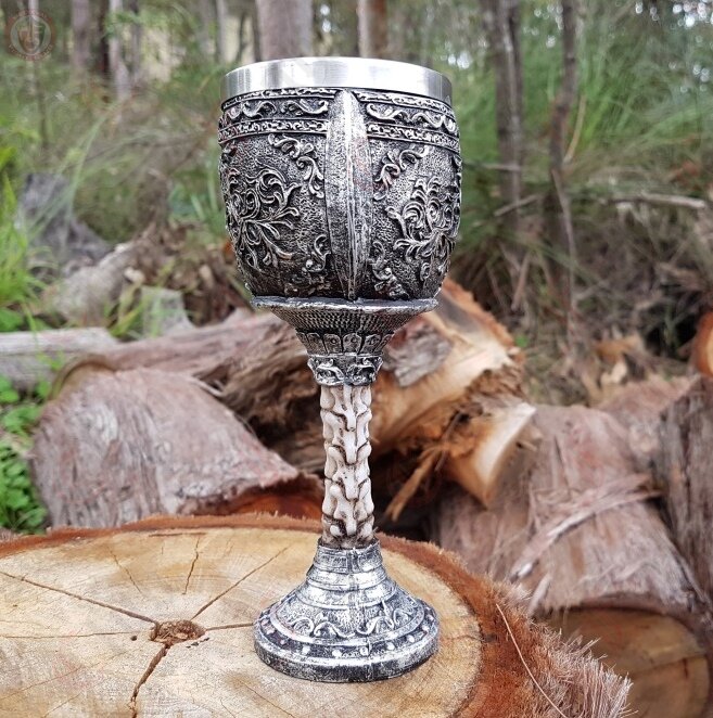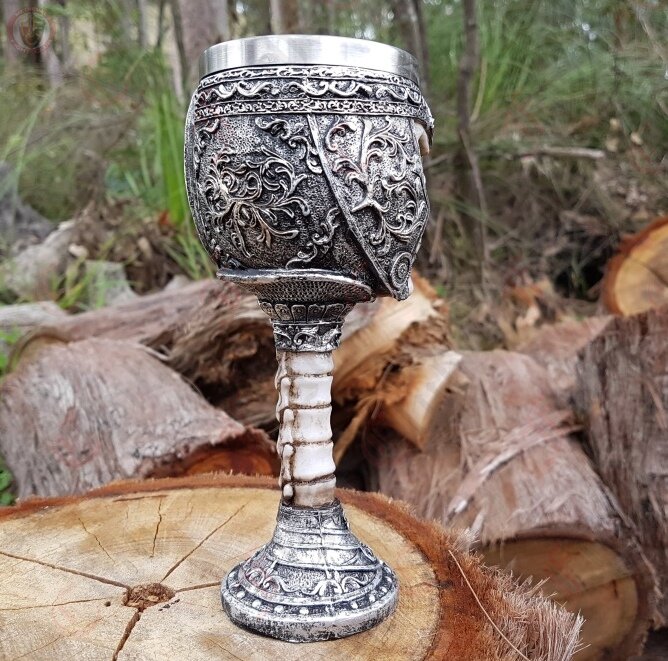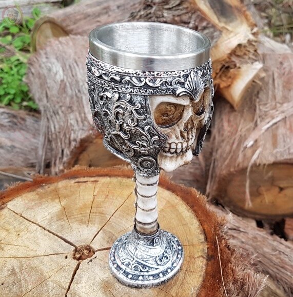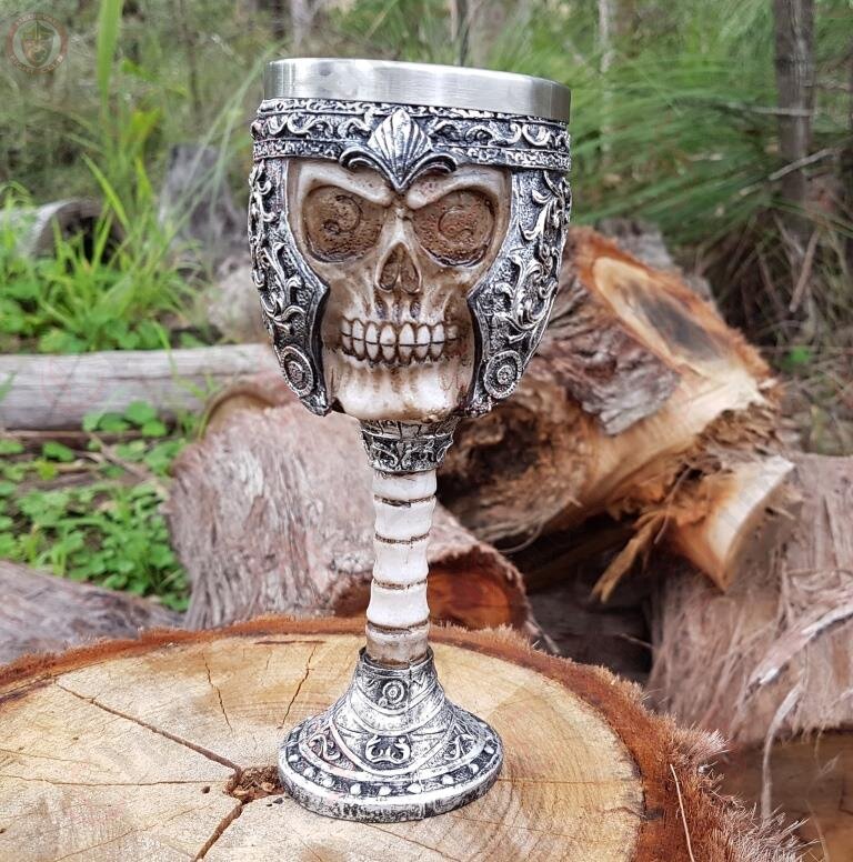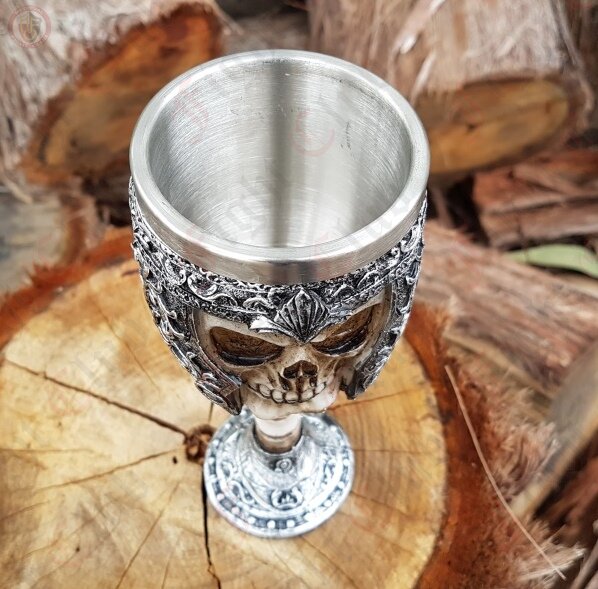 This goblet features a skeleton head wearing a steel helmet. The spine of the skeleton is used to create the stem of the goblet.