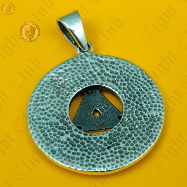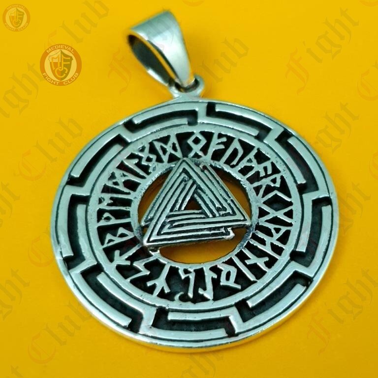 This pendant features a prominent central Valknut, surrounded by runic inscriptions and a sun wheel.