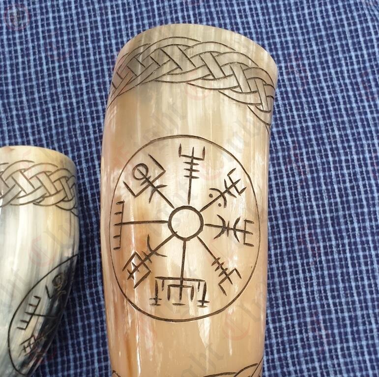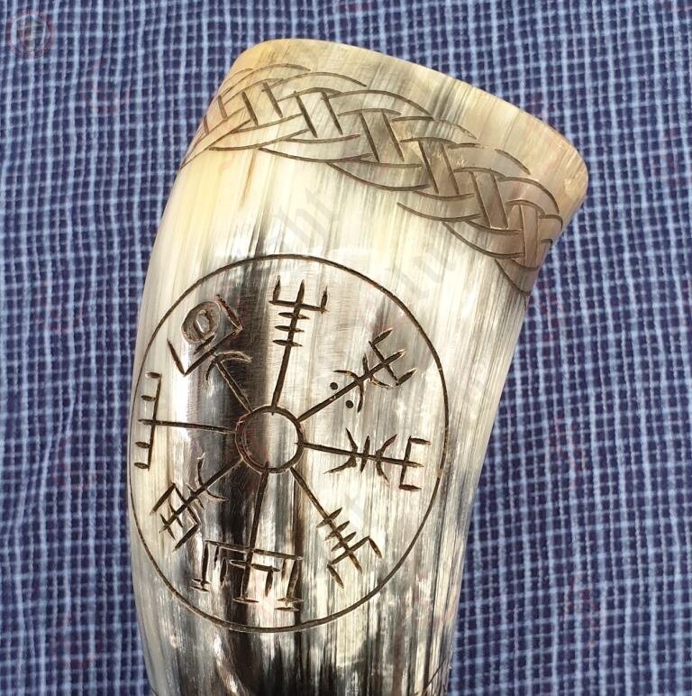 The symbol carved onto this drinking horn is the  Norse protection symbol called Vegvísir.