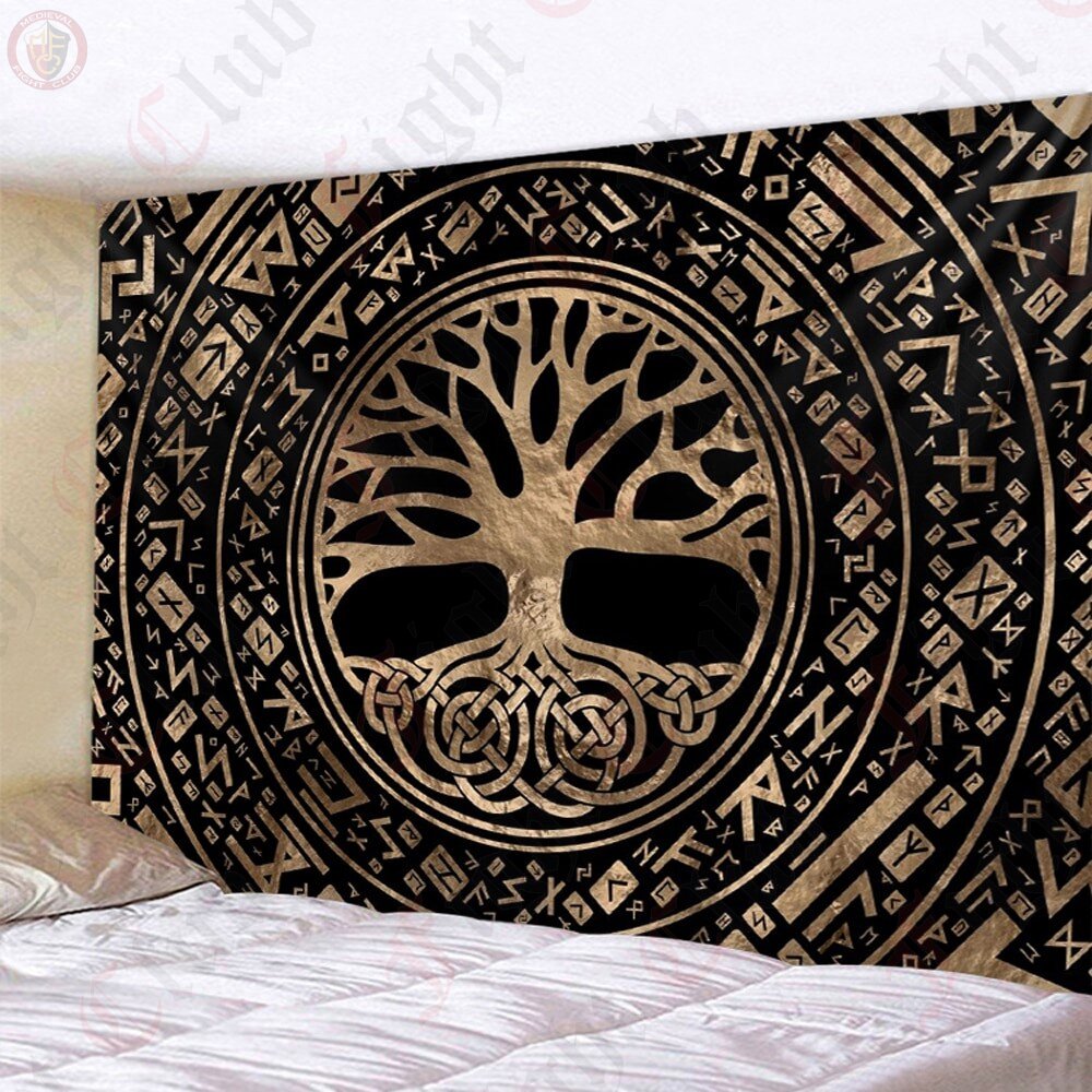 This large wall hanging with a tree of life, surrounded by Norse runes would look just as great as a table cover as it would on your wall