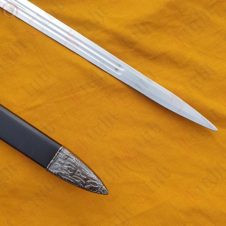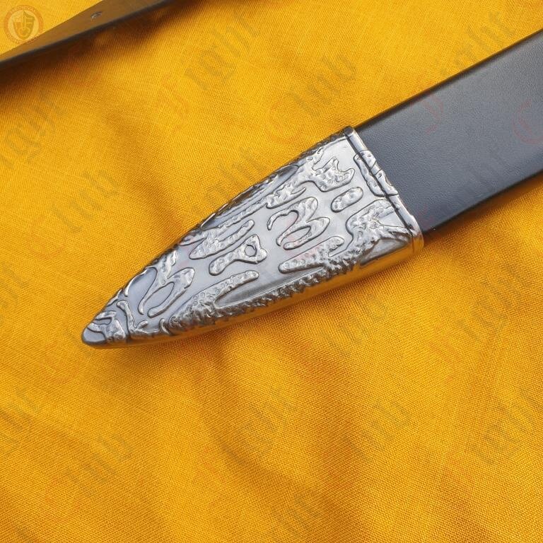 It features a stainless steel blade, wire wrapped hilt, and a faux-leather back scabbard with stainless steel locket and chape. This sword perfect for costume or display.